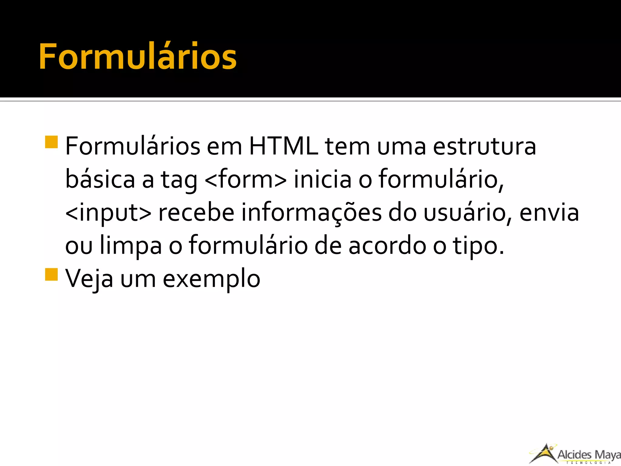 O documento descreve os principais elementos de formulários em HTML, incluindo as tags <form> e <input> e seus diferentes tipos como texto, senha, botões de opção, caixas de seleção e menus suspensos. Também explica outros elementos como textareas, campos de email e seletores numéricos.