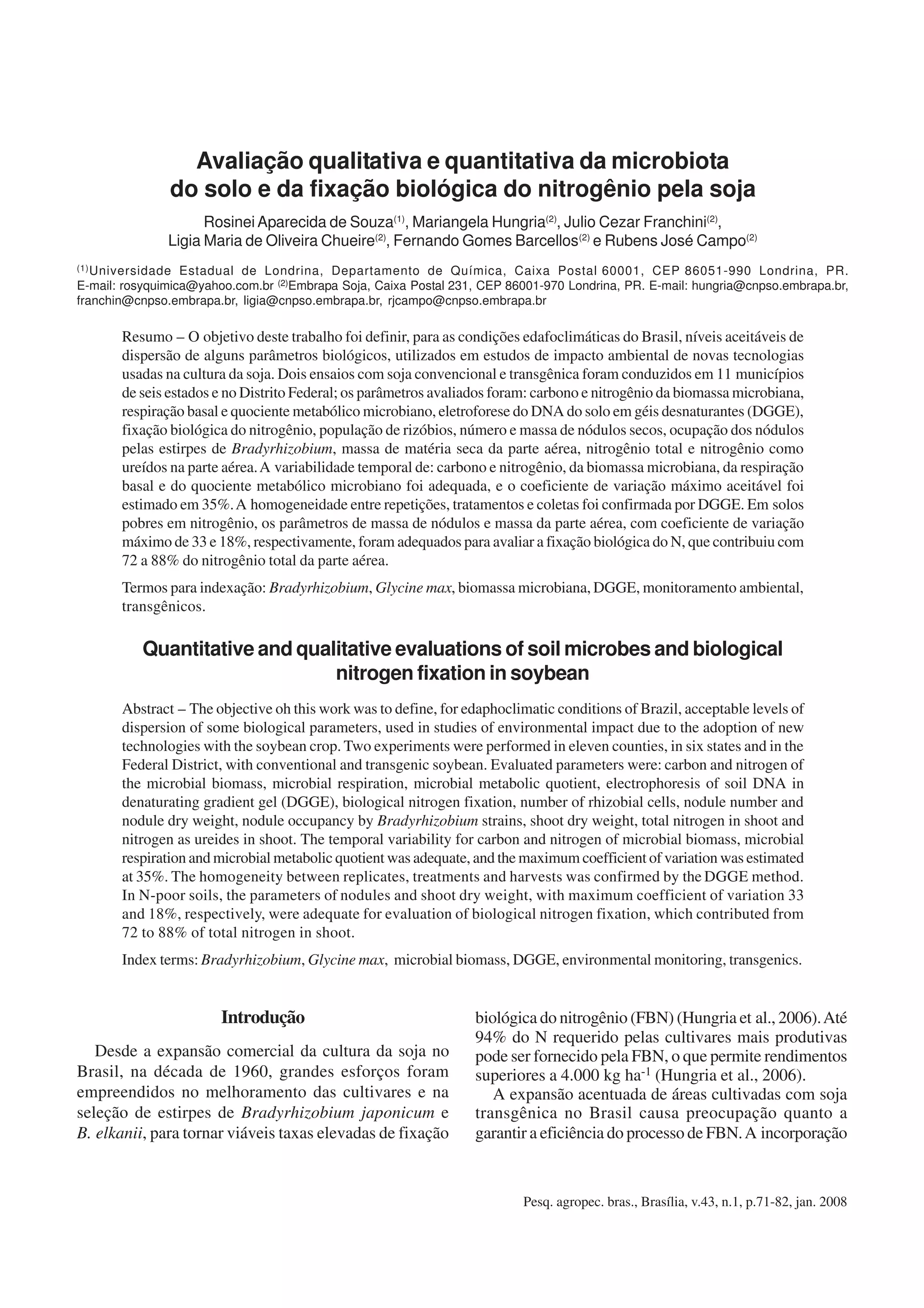 Este estudo avaliou parâmetros microbiológicos do solo e da fixação biológica de nitrogênio em soja convencional e transgênica em diferentes locais no Brasil. Os resultados mostraram que a variabilidade temporal de parâmetros como carbono e nitrogênio da biomassa microbiana foi adequada, com coeficiente de variação máximo de 35%. Parâmetros como massa de nódulos e parte aérea também apresentaram boa precisão para avaliar a fixação biológica de nitrogênio, que contribuiu com 72-88% do