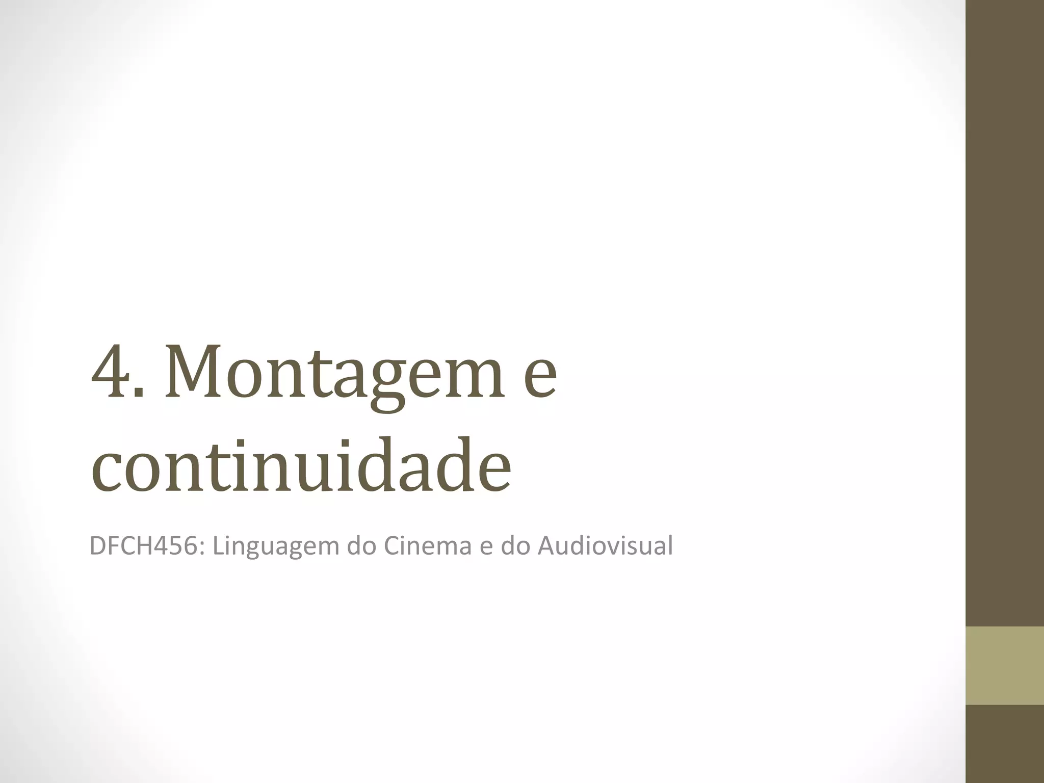 O documento discute técnicas de montagem cinematográfica como transições entre cenas, raccords para ligar planos de forma a manter a continuidade narrativa e visual, e exemplos históricos de uso de plano/contraplano, montagem alternada e montagem construtiva/analítica. Também aborda como a televisão e mudanças de contexto influenciaram a evolução da montagem no cinema contemporâneo para planos mais próximos e ritmo mais acelerado.