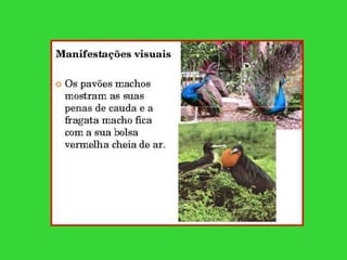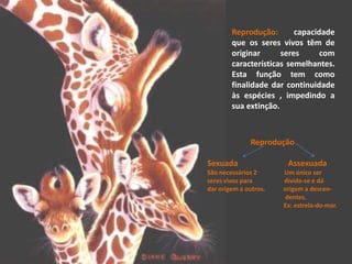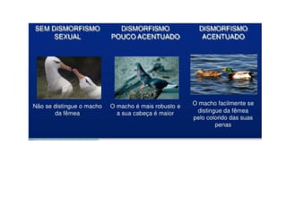 Este documento discute os processos de reprodução em animais, incluindo reprodução sexuada e assexuada. Detalha as etapas da reprodução sexuada, como a formação do ovo através da união de espermatozoides e óvulos. Também aborda a parada nupcial, o desenvolvimento embrionário e os tipos de desova.