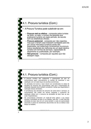 O documento discute a análise económica da procura turística, definindo procura turística, perspectivas de quantificação (física, monetária, geográfica, global) e indicadores utilizados (número de hóspedes, dormidas, taxa de ocupação, receitas). Também explica determinantes econômicos da procura como rendimento, preços, demografia e urbanização.