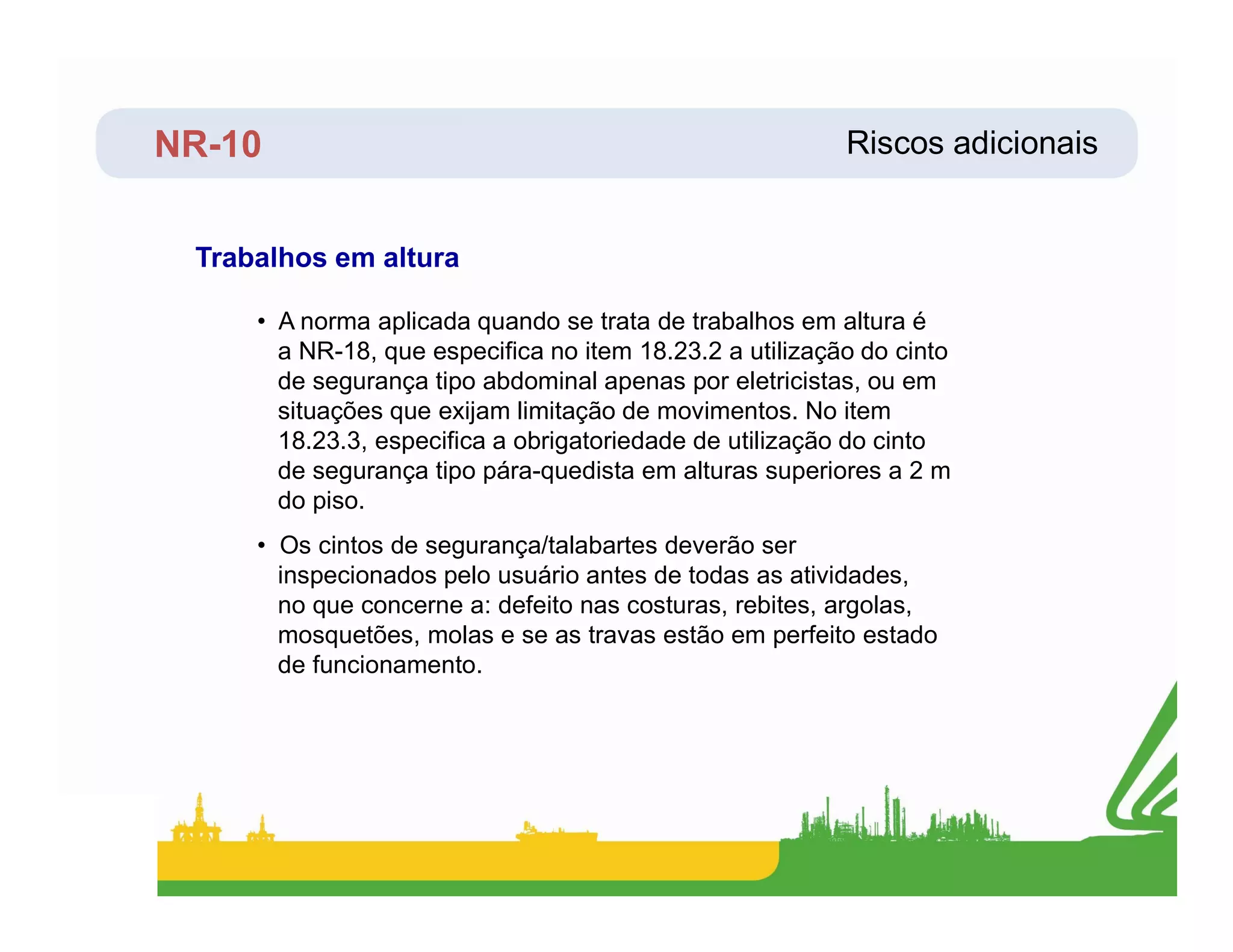 O documento discute riscos associados a trabalhos em altura, espaços confinados e condições atmosféricas. Ele especifica que a NR-18 exige o uso de cinto de segurança tipo pára-quedista em alturas acima de 2m e lista procedimentos de segurança para trabalhos em altura e espaços confinados.