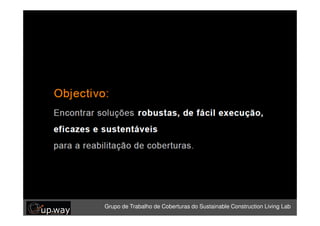 O documento descreve os requisitos para membranas de impermeabilização, isolamento térmico e fixações para coberturas sustentáveis. Busca-se materiais seguros, leves, resistentes, eficientes energeticamente, de fácil instalação e manutenção, e que promovam a sustentabilidade ao longo de seu ciclo de vida.