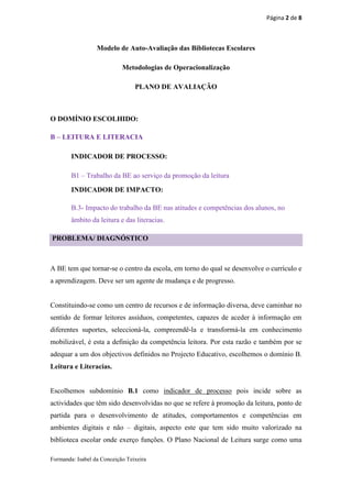 O documento descreve um plano de autoavaliação de uma biblioteca escolar para avaliar seu trabalho na promoção da leitura e literacia entre os alunos. O plano avaliará os domínios de leitura e literacia através de questionários, registros de empréstimos, observações e trabalhos dos alunos. Os dados serão analisados e um relatório será apresentado com conclusões e planos de melhoria.
