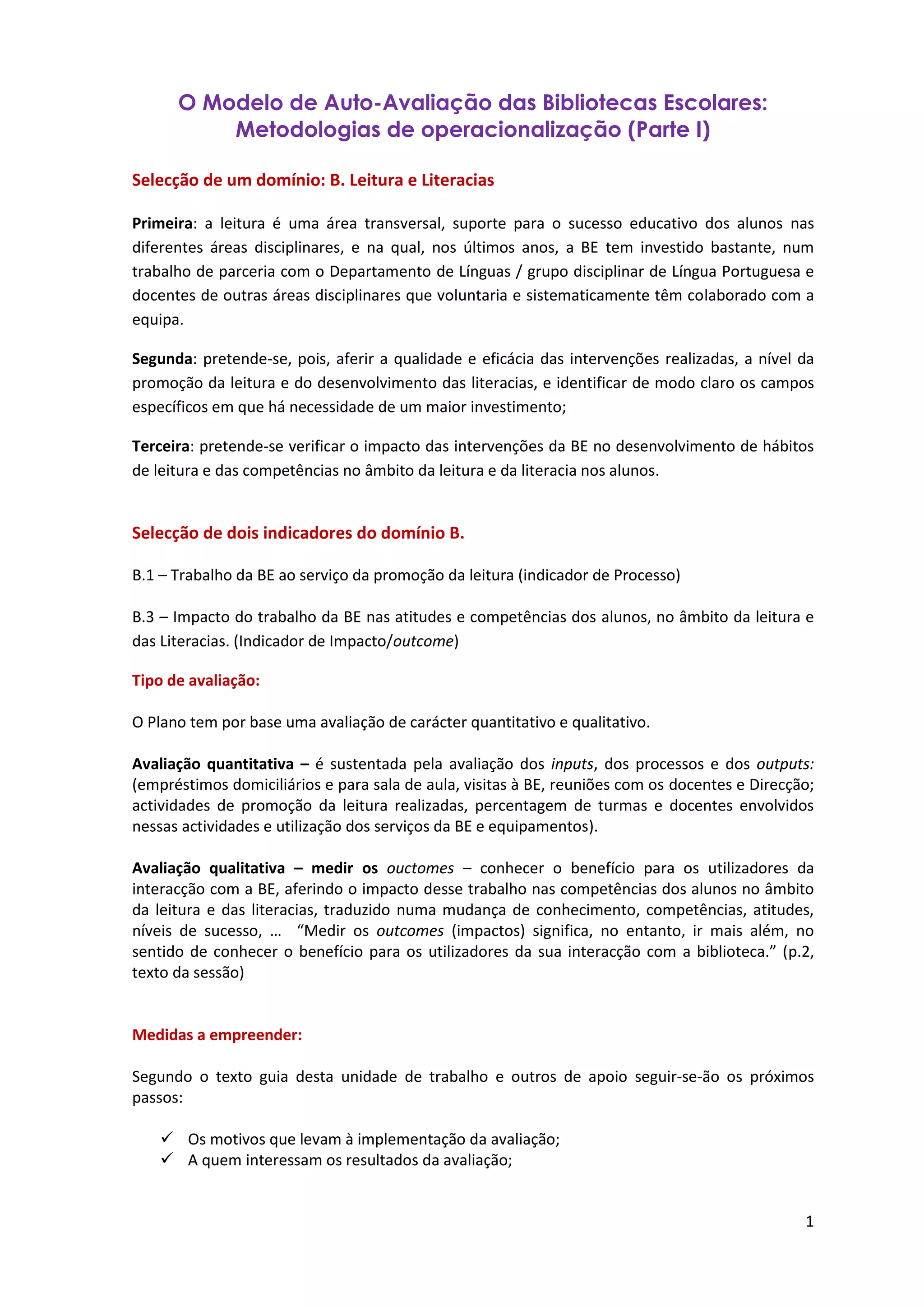 Este documento descreve o processo de autoavaliação de uma biblioteca escolar, focando-se na área da leitura e literacia. Ele detalha os indicadores e métodos de avaliação quantitativa e qualitativa a serem utilizados, como questionários e observações. O objetivo é medir o impacto das atividades da biblioteca no desenvolvimento de hábitos de leitura e competências dos alunos, para identificar áreas que precisam de melhoria.