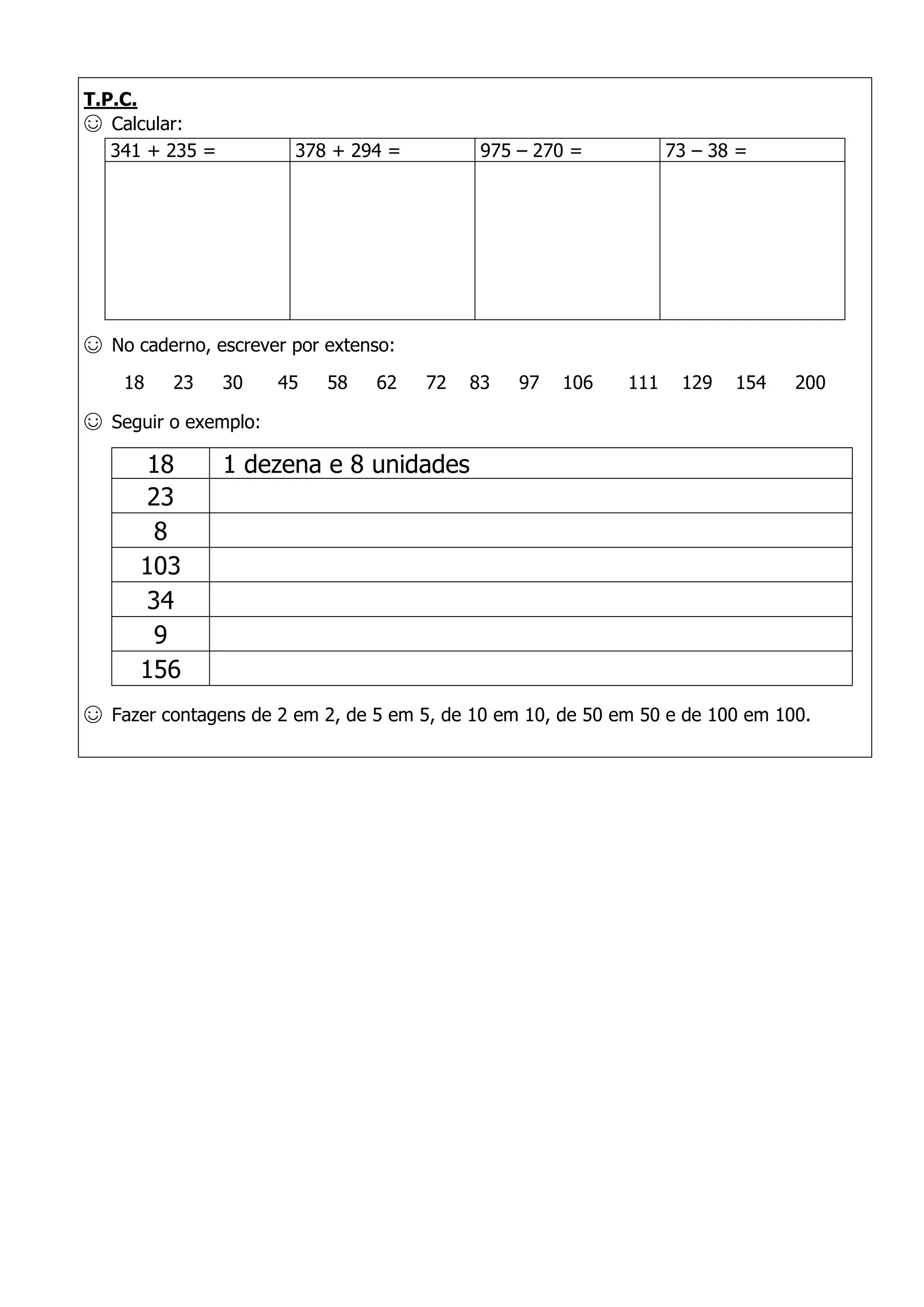 O documento pede para calcular algumas expressões aritméticas, escrever por extenso números de 1 a 200, seguir um exemplo de escrita por extenso e fazer contagens de números de forma crescente.