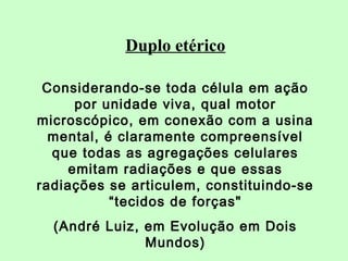 O documento discute o duplo etérico, os centros vitais e as causas das enfermidades. Explica que o duplo etérico é um corpo energético que envolve o corpo físico e contém os sete principais centros vitais. Estes centros captam e distribuem energias e quando desequilibrados podem causar doenças. As enfermidades podem ter origem em fluidos ambientais, obsessões espirituais ou causas kármicas de vidas passadas.
