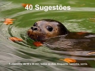 2) Fornece 40 sugestões para viver uma vida mais feliz e significativa, como caminhar diariamente, comer alimentos naturais, sorrir mais, e apreciar os momentos com amigos e família.