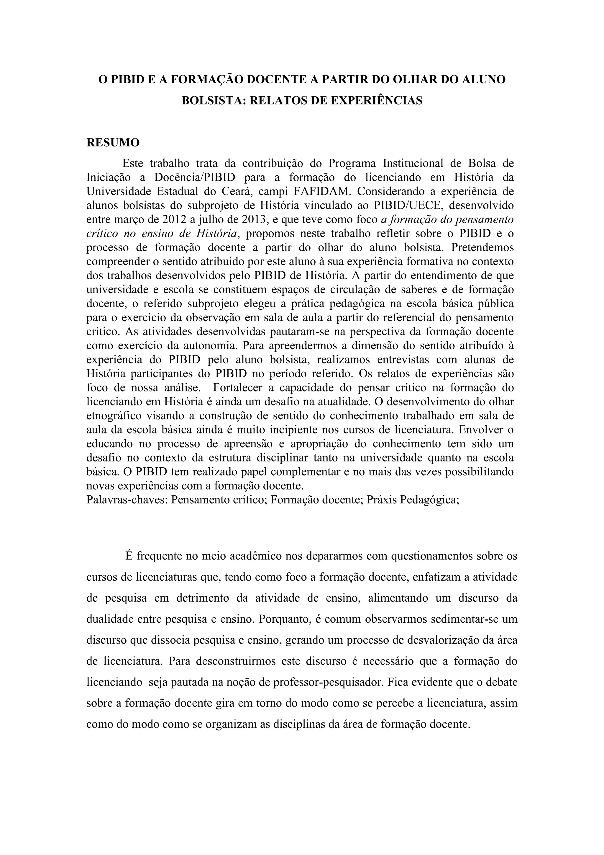 O documento discute a contribuição do Programa Institucional de Bolsa de Iniciação à Docência (PIBID) para a formação de licenciandos em História da Universidade Estadual do Ceará. Analisa relatos de experiências de alunos bolsistas do PIBID que apontaram a importância da vivência na escola básica pública para o desenvolvimento do pensamento crítico e da prática docente. Também debate os desafios da formação de professores nas universidades e a necessidade de maior integração entre teoria e prática.