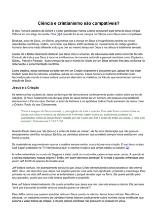 1) O documento debate se a ciência e a crença em Deus são compatíveis, com Dawkins argumentando que a ciência contradiz a crença em Deus e Collins tendo uma visão diferente de compatibilidade.