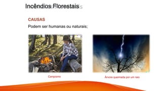 O documento discute as causas, consequências e medidas de prevenção de incêndios florestais em Portugal. As causas podem ser humanas, como negligência ou atos intencionais, ou naturais como raios. Os incêndios florestais causam danos à vegetação e solo, reduzindo a biodiversidade e poluindo o ar. É importante educar a população e monitorar as florestas para prevenir incêndios.