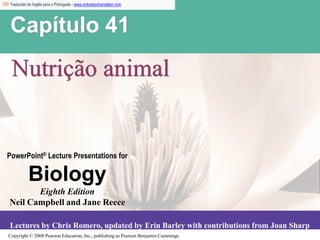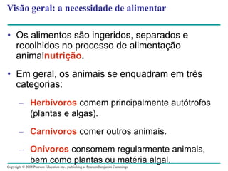 O documento discute a nutrição animal, cobrindo os seguintes pontos principais: 1) Os animais precisam obter energia química, carbono orgânico e nitrogênio orgânico de sua dieta, bem como nutrientes essenciais como aminoácidos, ácidos graxos, vitaminas e minerais. 2) Os animais podem ser herbívoros, carnívoros ou onívoros dependendo de suas fontes alimentares. 3) A digestão processa os alimentos através de compartimentos digestivos e glândulas acessó