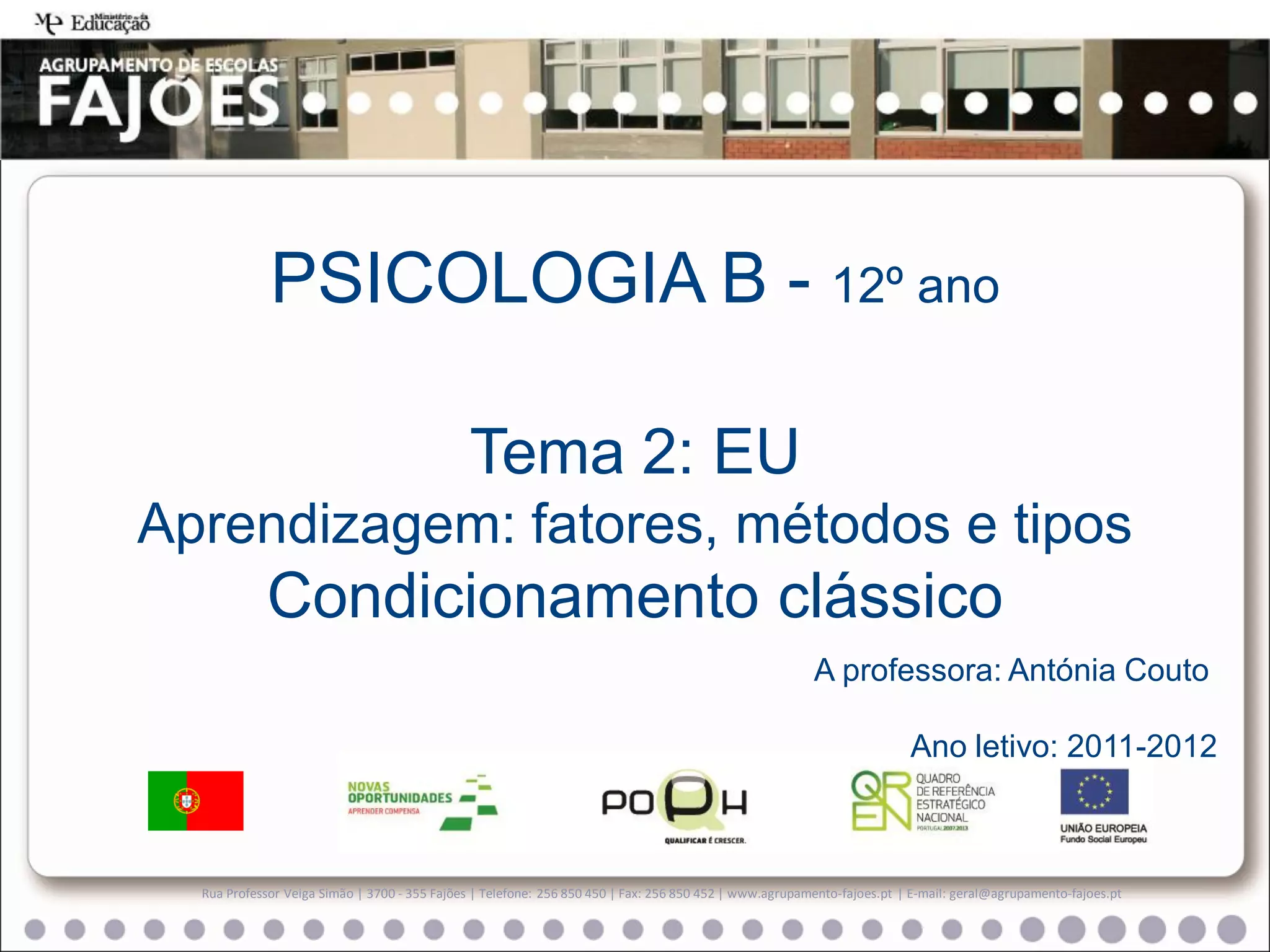 O documento discute os fatores e métodos de aprendizagem, incluindo o condicionamento clássico. Descreve como o condicionamento clássico envolve associar um estímulo neutro, como um som, a um estímulo incondicionado, como a apresentação de comida, de modo que o som sozinho eventualmente provoque a mesma resposta, como salivação. Explica que a associação deve ocorrer repetidamente e o estímulo neutro deve preceder o incondicionado para que o reflexo condicionado se est