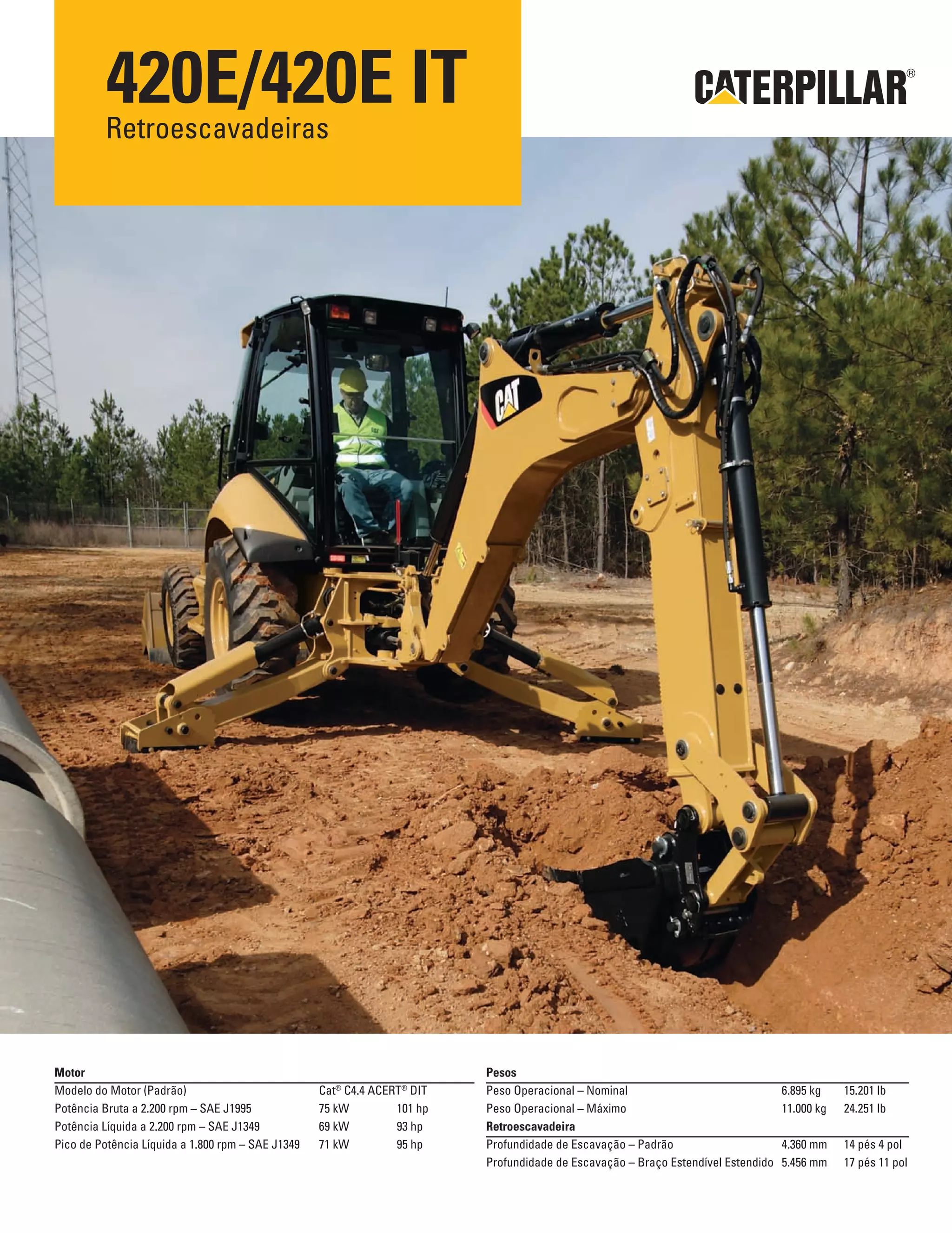 Este documento fornece especificações e detalhes sobre as retroescavadeiras 420E/420E IT da Caterpillar. Inclui informações sobre o motor, peso, profundidade de escavação, características da cabine, controles, sistema hidráulico, trem de força e ferramentas de trabalho.