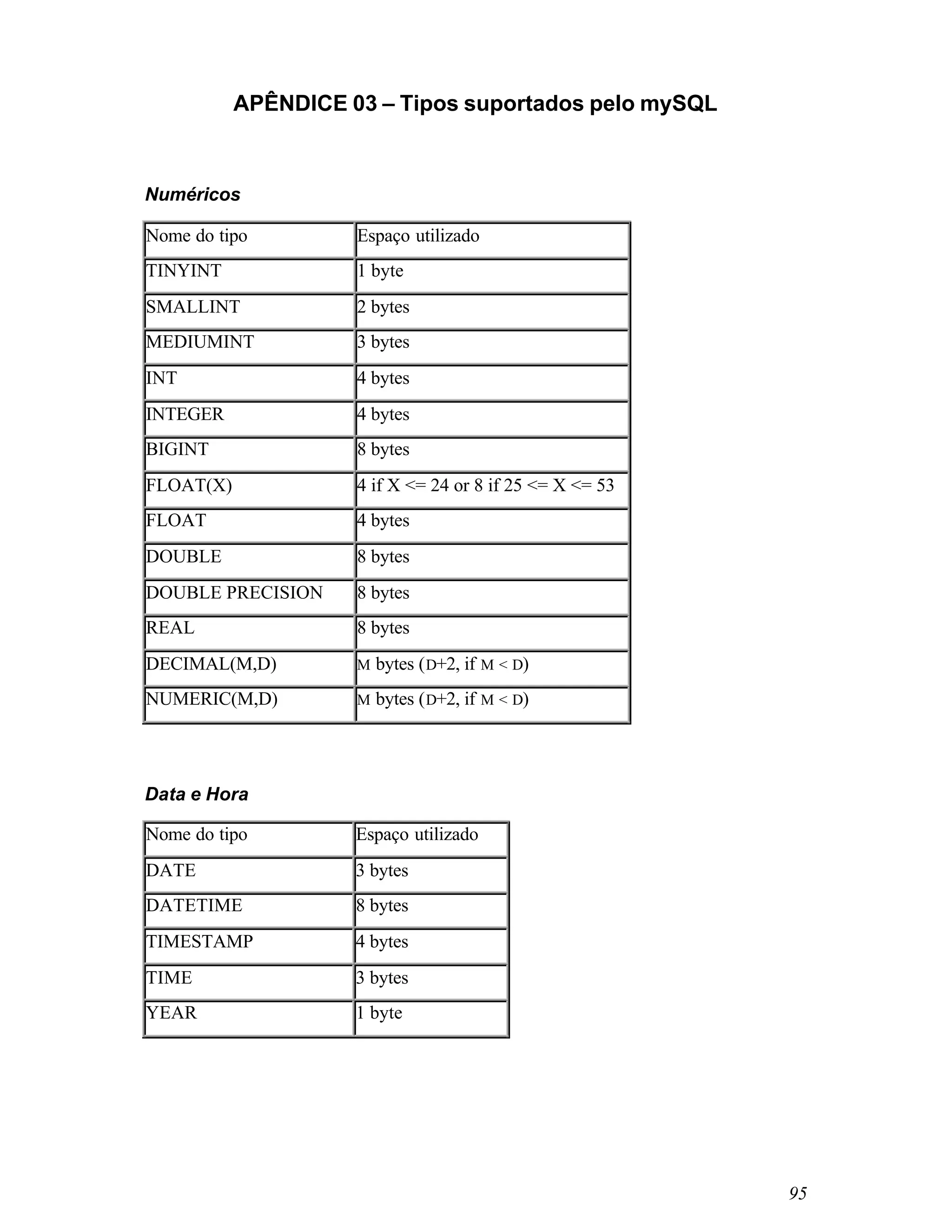 Os principais tipos de dados suportados pelo mySQL para armazenamento de strings, numéricos e datas são descritos no documento. Strings podem ser armazenadas usando CHAR, VARCHAR, TINYBLOB entre outros e ocupam espaço de 1 a 8 bytes dependendo do tipo e tamanho. Números são armazenados usando TINYINT, SMALLINT, INT e outros e ocupam de 1 a 8 bytes. Datas usam DATE, DATETIME e TIMESTAMP e ocupam de 3 a 8 bytes.