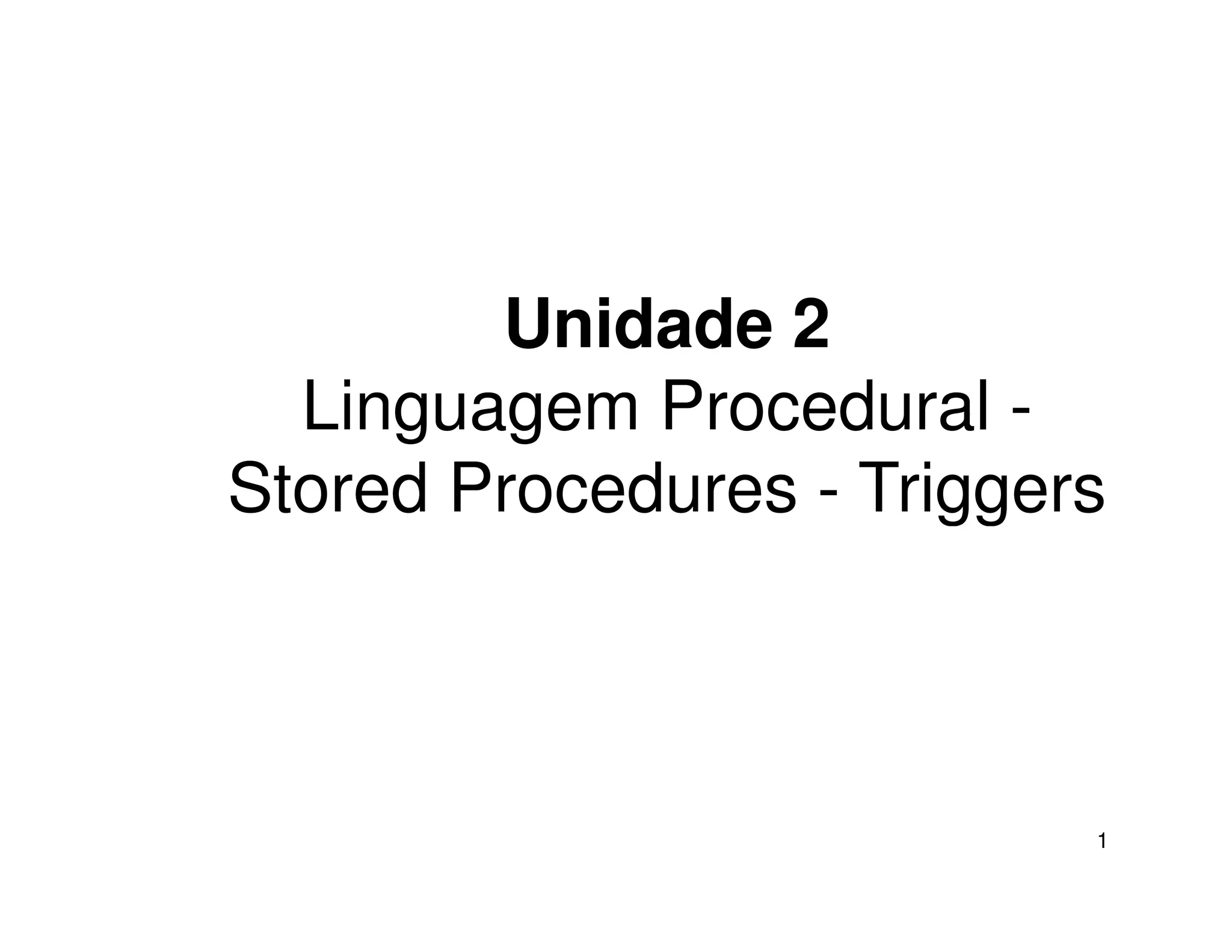 O documento discute linguagens procedurais para manipulação de bancos de dados relacionais, incluindo PL/SQL, stored procedures, stored functions e triggers. Também aborda tópicos como declaração de variáveis, estruturas de controle, cursores e programas PL/SQL como procedures e packages.