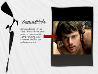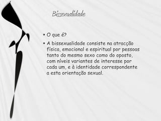 O documento discute a heterossexualidade e a homossexualidade no século XX. Ele explica que a homossexualidade deixou de ser considerada uma doença e que a maioria dos países não criminaliza relações entre pessoas do mesmo sexo, com alguns tratando-as com igualdade em relação às relações heterossexuais. O documento também define os termos "gay", "lésbica" e "homossexual masculino" e "feminino".