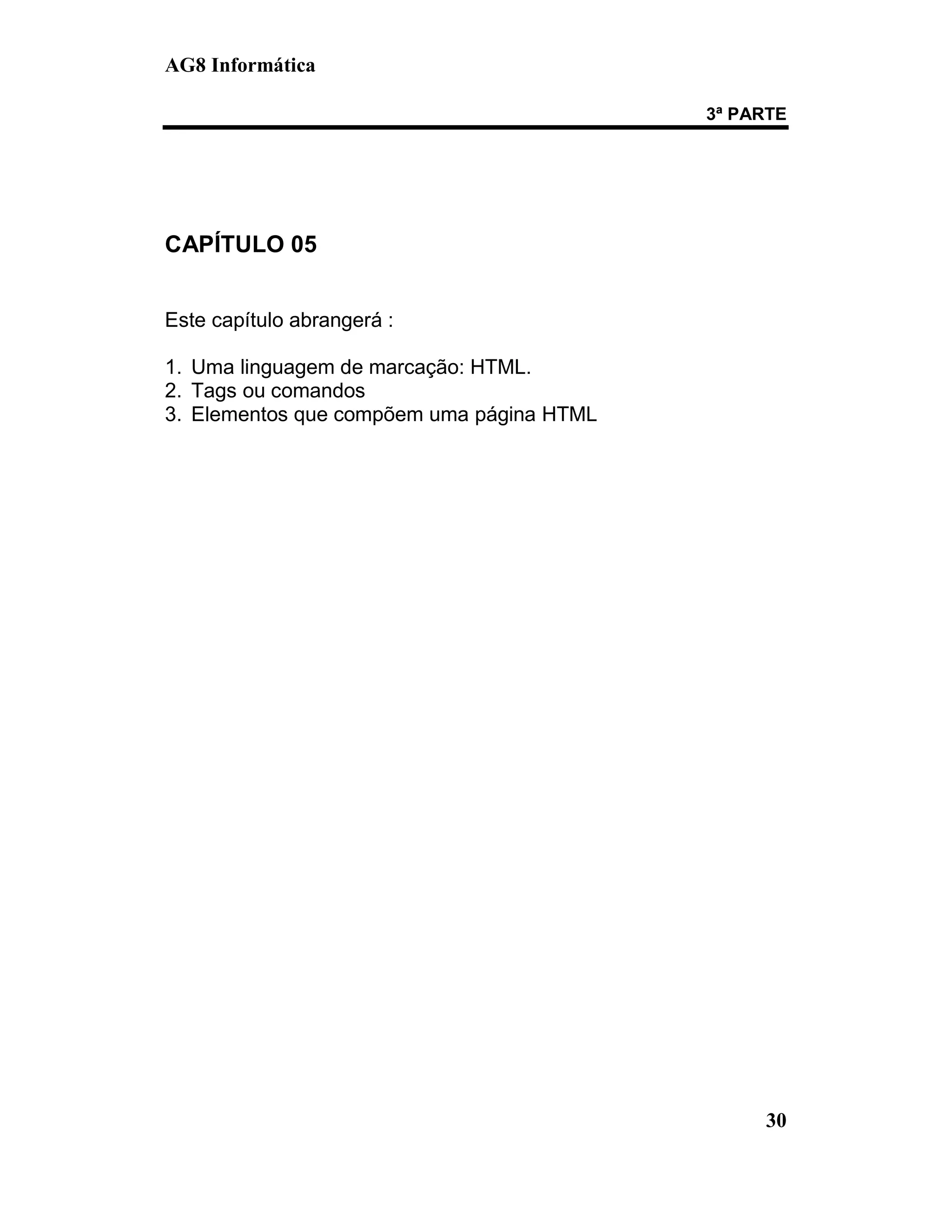 Este documento apresenta uma introdução à linguagem HTML, descrevendo seus principais elementos como tags, cabeçalhos, parágrafos e links. Explica a estrutura básica de uma página HTML e exemplos de como formatar texto usando tags como <b> para negrito e <i> para itálico.