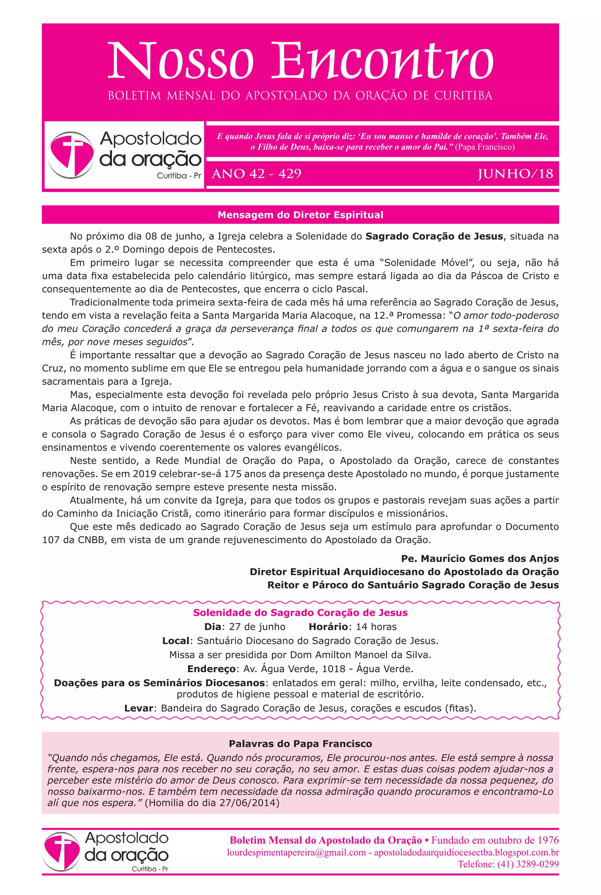 Este boletim mensal do Apostolado da Oração discute a devoção ao Sagrado Coração de Jesus e como os leigos podem realizar sua missão imitando o Coração de Jesus. O documento também fornece informações sobre eventos futuros, incluindo uma celebração do Sagrado Coração de Jesus e uma viagem jubilar para comemorar os 175 anos do Apostolado da Oração.
