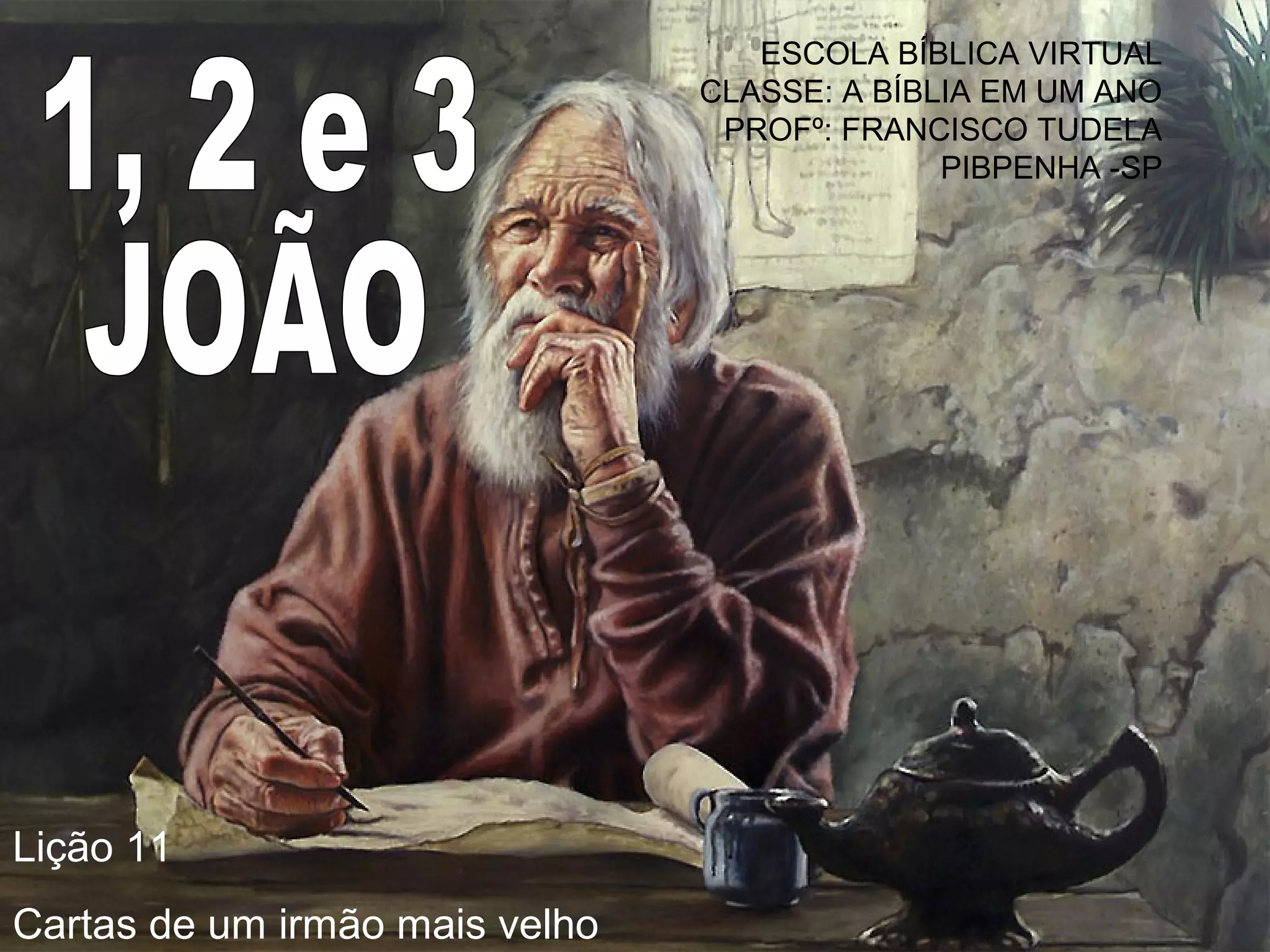 Este documento resume informações sobre a primeira carta de João. Ele discute os propósitos da carta, sua estrutura e temas centrais. A carta trata da comunhão com Deus e fornece testes para a fé e vida cristãs, como a obediência, o amor e a verdade. A cristologia é o tema central, afirmando que Jesus é o Filho de Deus e homem perfeito, contra as falsas doutrinas da época.