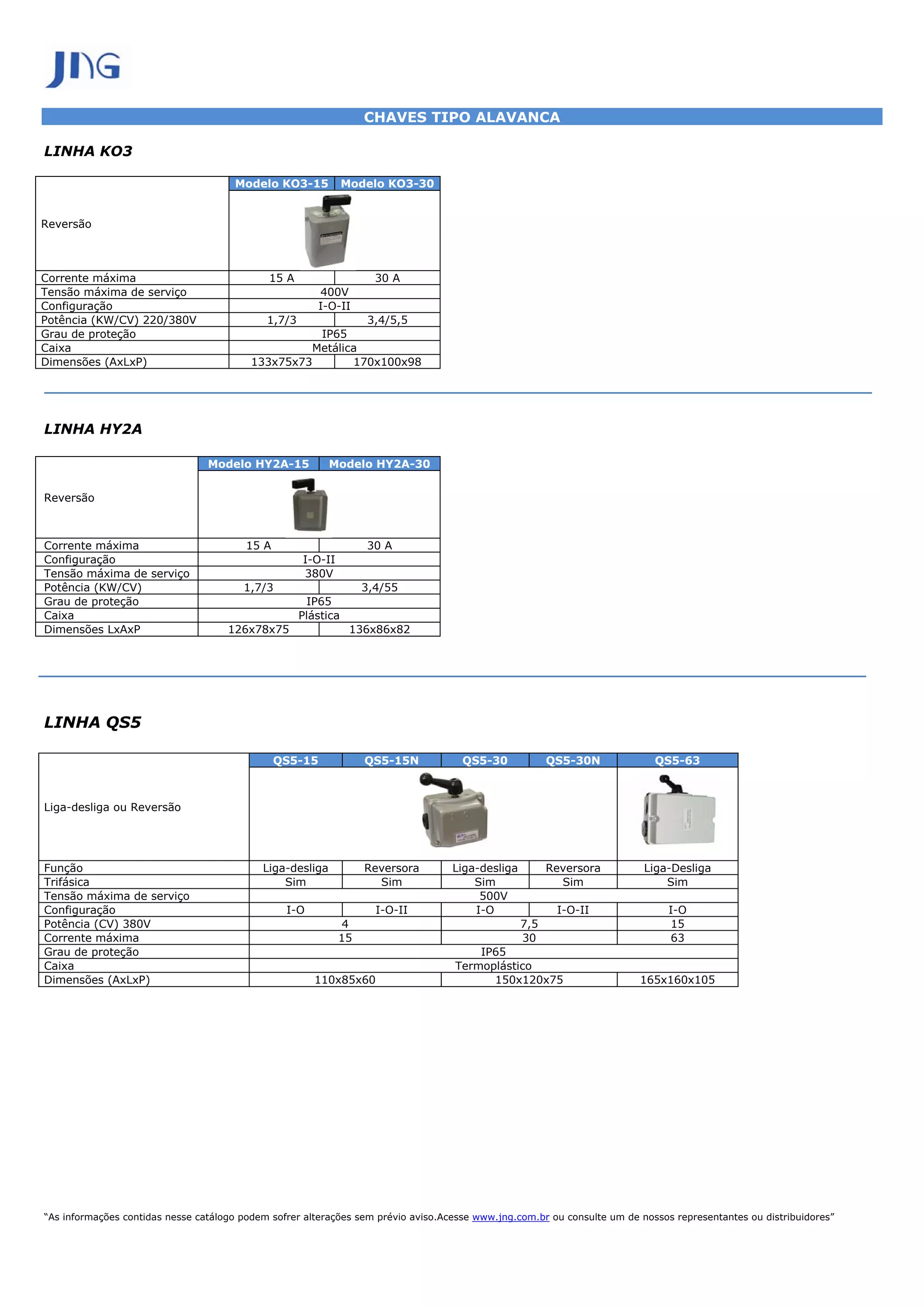 Este documento apresenta modelos de chaves tipo alavanca de três linhas diferentes: KO3, HY2A e QS5. A linha KO3 possui modelos de 15A e 30A para tensões de 220/380V e 400V. A linha HY2A tem modelos de 15A e 30A para 380V. A linha QS5 oferece modelos de 15A, 30A, 63A para 500V, com opções de liga-desliga ou reversão, proteção IP65 e caixa termoplástica. As dimensões e especificações técnicas variam entre os modelos