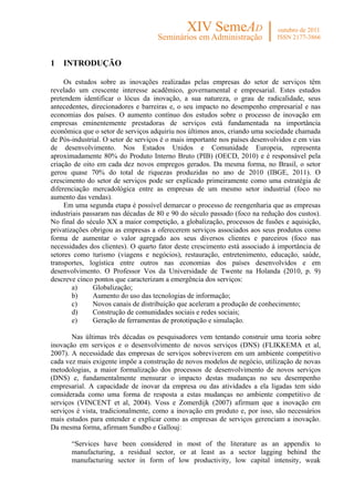 Este documento apresenta um estudo de caso sobre inovação em serviços no setor de saúde suplementar no Brasil. O estudo analisa como uma empresa líder do setor inova, desenvolve novos serviços e mede os resultados das inovações. O modelo de inovação predominante é o incremental, focado em entrega de serviços e tecnologia por meio de projetos internos, e os principais indicadores são financeiros. A inovação é vista como fator crítico para a sobrevivência da empresa.