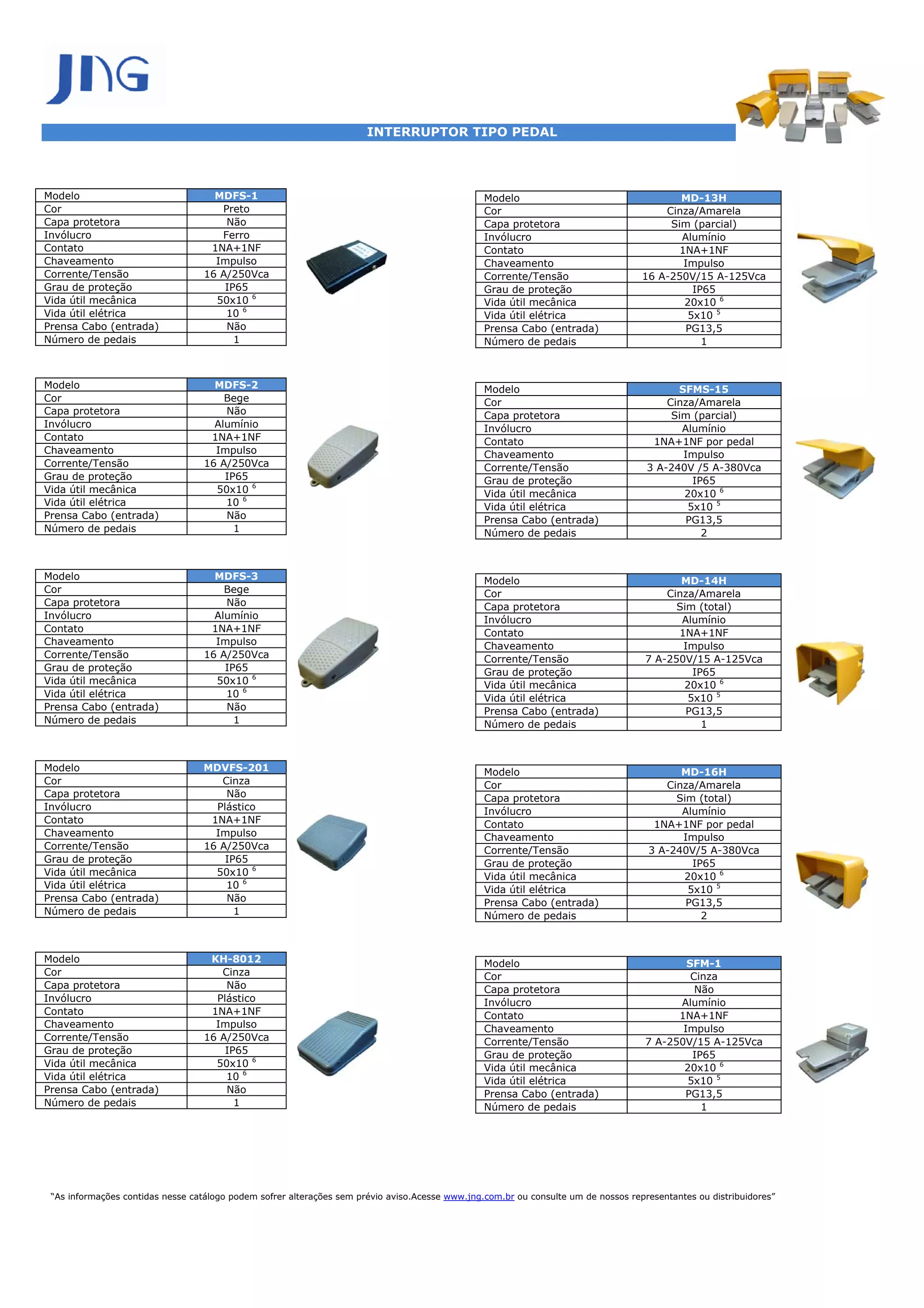 Este documento fornece especificações técnicas de 10 modelos diferentes de interruptores do tipo pedal. As especificações incluem cor, material do invólucro, tipo e número de contatos, corrente/tensão suportada, grau de proteção, vida útil mecânica e elétrica e número de pedais. Os modelos variam em termos de especificações e recursos, como a presença de capa protetora e tipo de entrada de cabo.