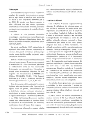 Este documento descreve um estudo sobre a caracterização de sintomas visuais de deficiência de micronutrientes em tomateiros cultivados em solução nutritiva. Os primeiros sintomas ocorreram nas deficiências de ferro e zinco, manifestando-se como clorose nas folhas. A sequência de surgimento dos sintomas foi: ferro, zinco, cobre, manganês, molibdênio e boro. A deficiência de zinco causou rachaduras nos frutos e a de boro causou podridão apical.