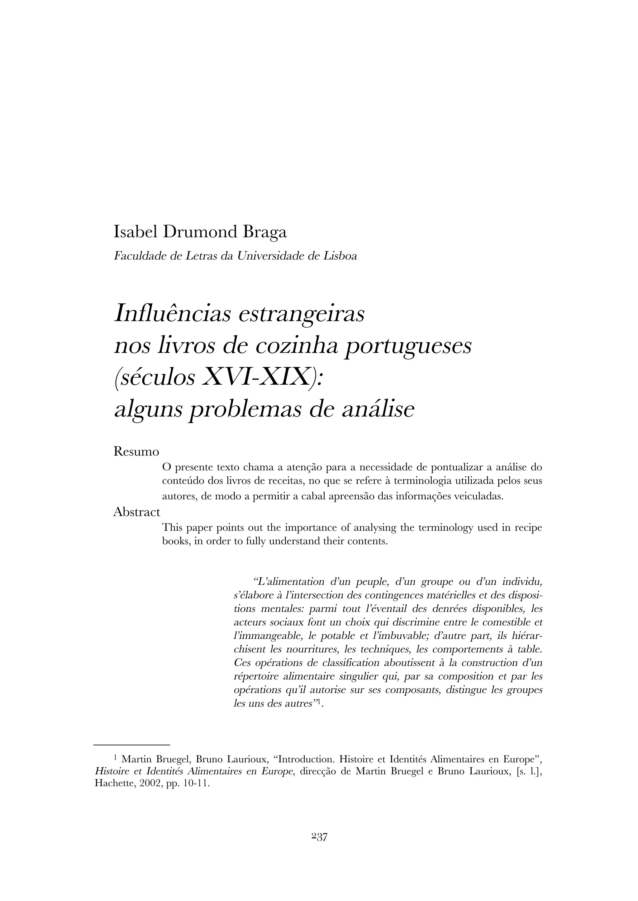 Este documento discute as influências estrangeiras nos livros de cozinha portugueses entre os séculos XVI e XIX. Aponta que as receitas apresentavam influências de países vizinhos como Espanha e Itália, identificadas por termos como "à francesa", "à italiana". Também discute que nem sempre é possível determinar com certeza a origem de algumas receitas apenas pelo nome.