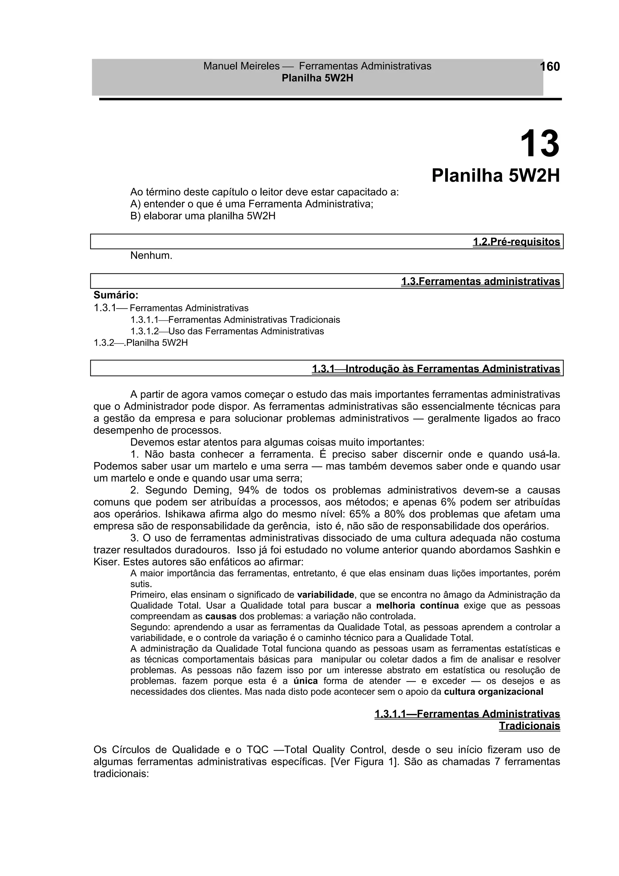 1) O documento discute as ferramentas administrativas e a planilha 5W2H. 2) A planilha 5W2H é uma ferramenta de planejamento que consiste em colunas para descrever o que, por que, quem, onde, quando e como de um projeto ou plano. 3) A planilha é usada para desdobrar objetivos em ações específicas e atribuir responsabilidades e prazos.