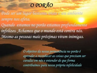 O documento descreve a jornada de cura e crescimento pessoal através de diferentes "andares" de uma casa. Cada andar representa um estágio onde se aprende lições valiosas sobre si mesmo e sobre como lidar com relacionamentos de forma saudável. O objetivo final é alcançar o sótão, um estado de amor próprio e consciência incondicional.