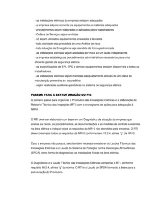O documento descreve o Prontuário das Instalações Elétricas (PIE), um sistema de informações sobre as instalações elétricas e segurança no trabalho. O PIE deve conter documentos como o Relatório Técnico das Inspeções, Laudo Técnico das Instalações Elétricas e Laudo do Sistema de Proteção contra Descargas Atmosféricas para garantir a segurança e conformidade com normas. Empresas com potência acima de 75 kW devem manter o PIE atualizado.
