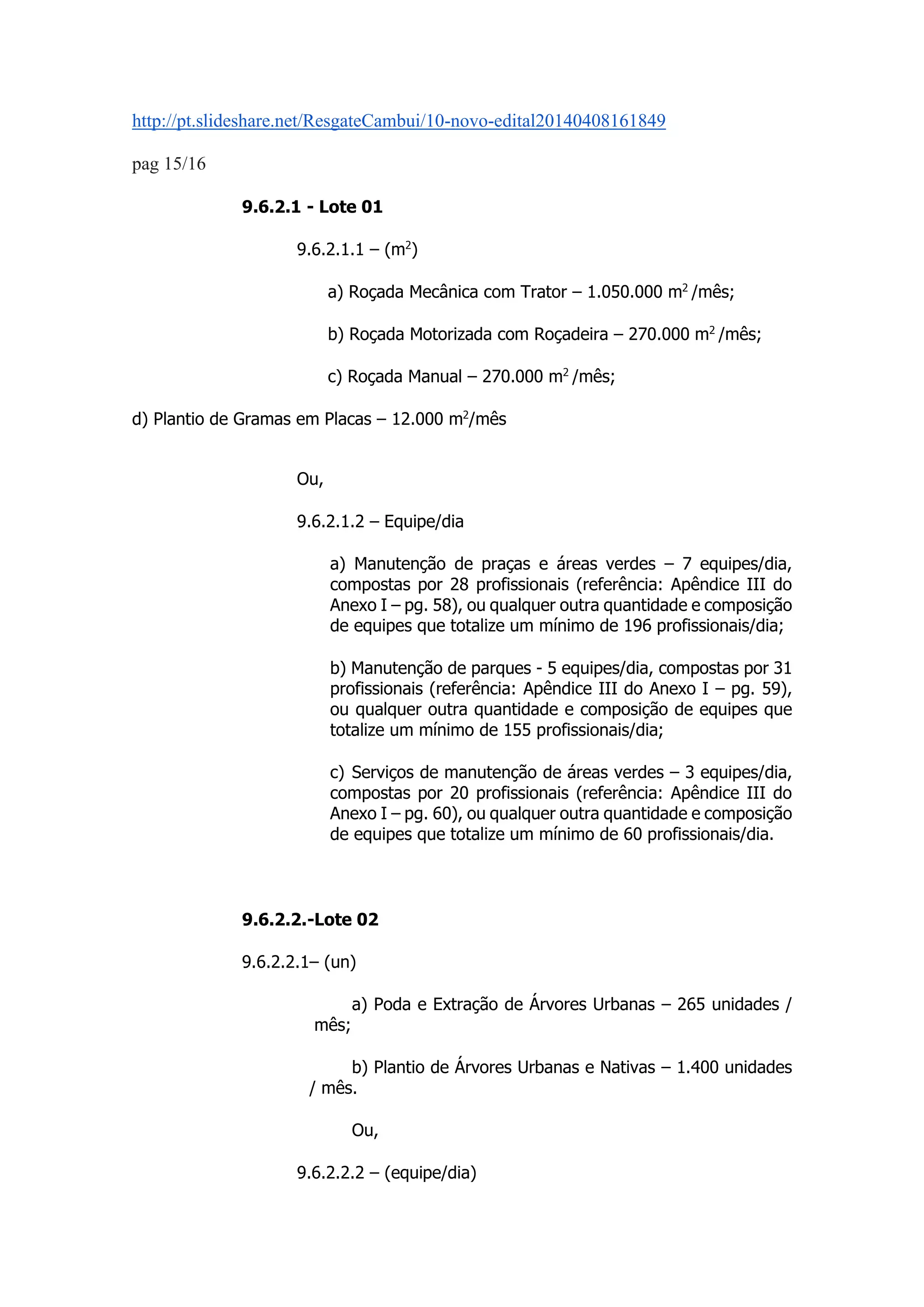 O documento descreve os serviços de manutenção de áreas verdes urbanas em Campinas, incluindo roçadas, plantio de grama e árvores. Estabelece três lotes de serviço: Lote 1 para manutenção de praças e parques, Lote 2 para poda e plantio de árvores, e equipe técnica para avaliação de pragas e doenças em árvores. Detalha as atividades e equipamentos necessários para cada lote.
