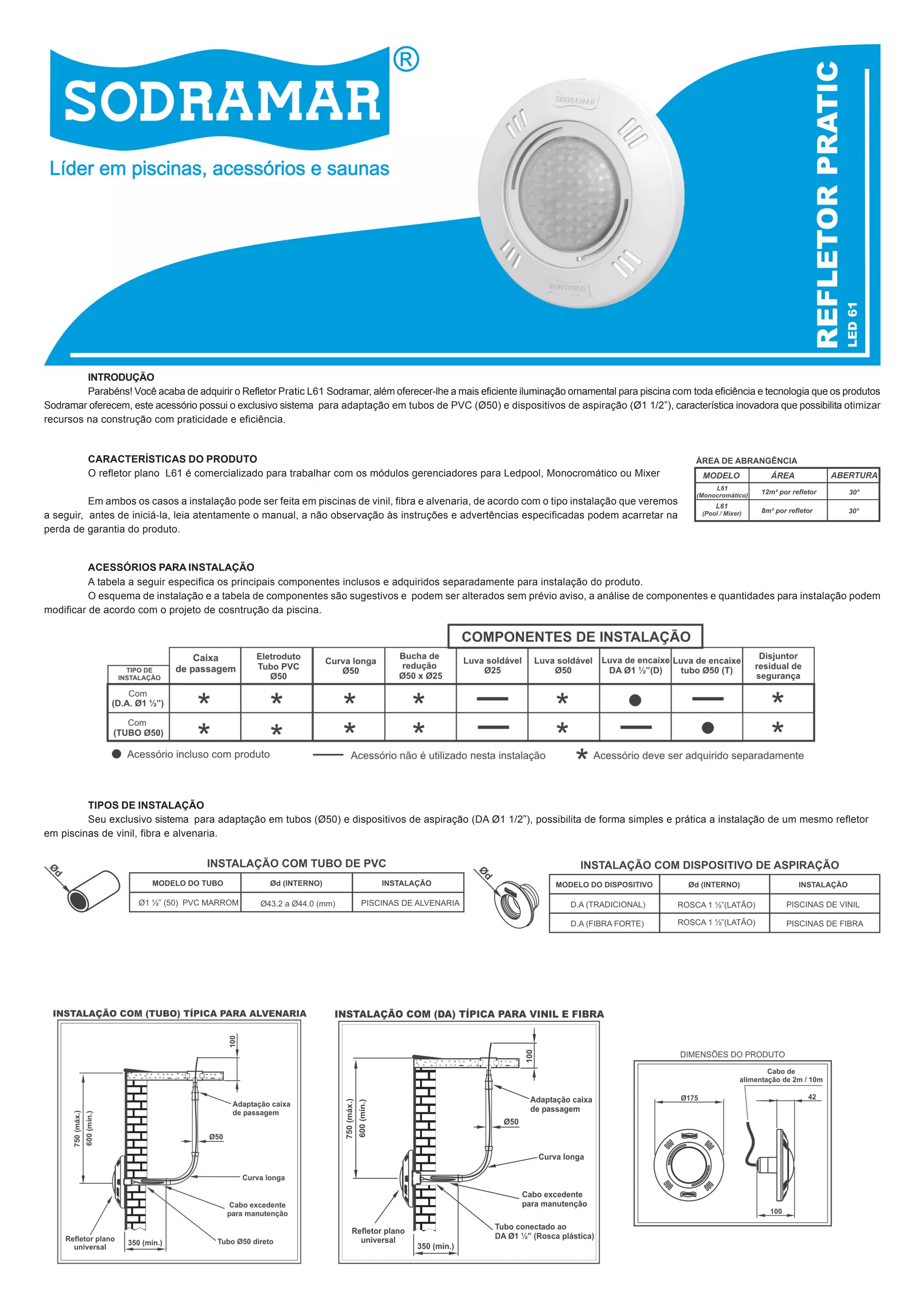 Parabéns! Você acabade adquirir o Refletor Pratic L61 Sodramar, além oferecer-lhe a mais eficiente iluminação ornamental para piscina com toda eficiência e tecnologia que os produtos