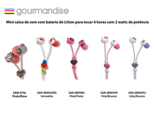 Este documento lista vários produtos eletrônicos portáteis, incluindo caixas de som sem fio com bateria que tocam por 4 horas, vários modelos de baterias recarregáveis universais com capacidades de 650 mAh a 2000 mAh, case de silicone e plástico para vários modelos de smartphones como Galaxy S, Blackberry e iPhone 4G em diferentes cores e estilos.