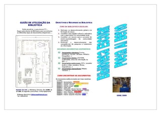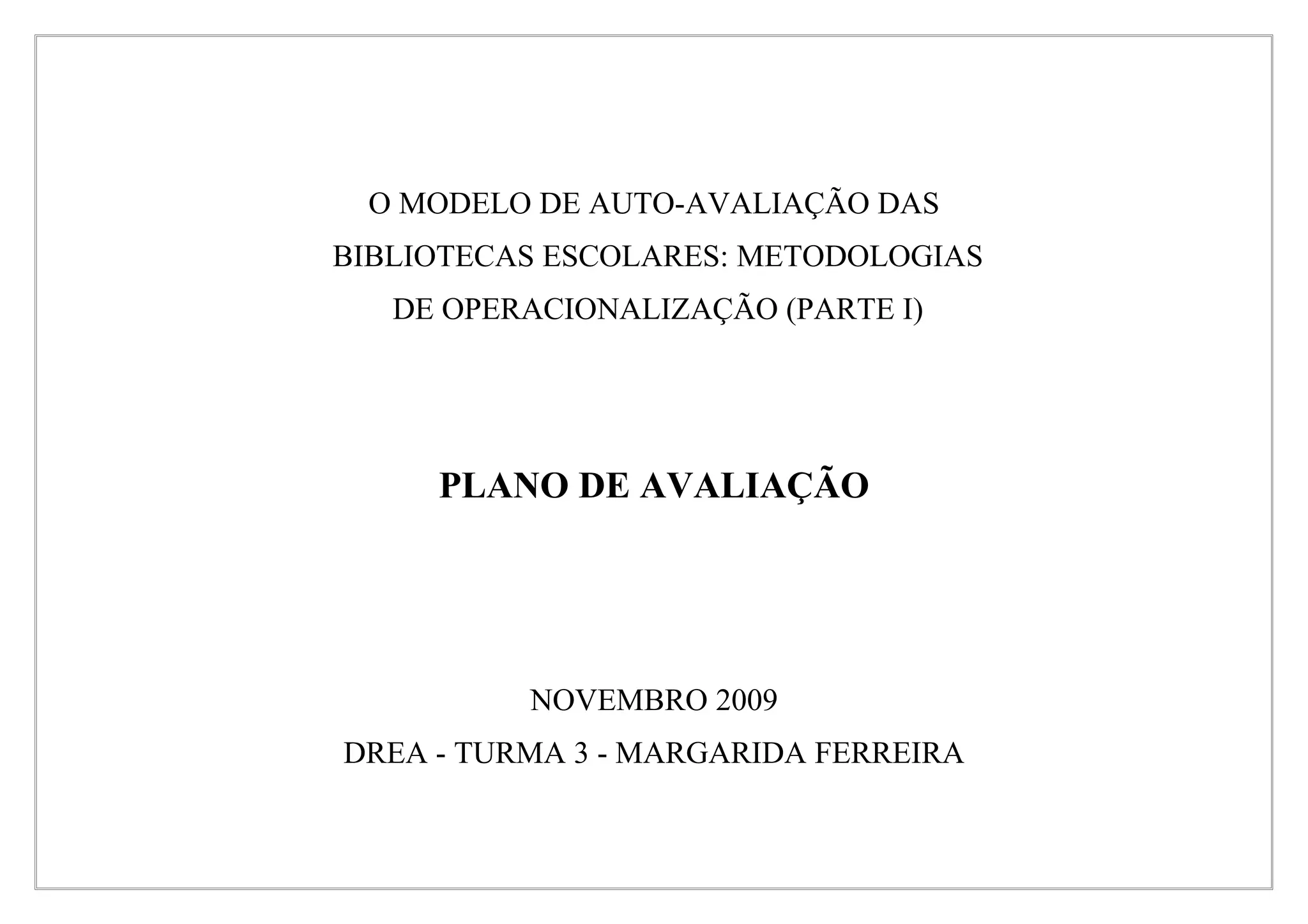 Este documento apresenta o plano de avaliação da biblioteca escolar usando o Modelo de Auto-Avaliação das Bibliotecas Escolares. O plano inclui selecionar o domínio a ser avaliado, definir amostras, recolher evidências, analisar dados, elaborar um relatório e preparar um plano de ação. O domínio selecionado é "Leitura e Literacia" e o plano fornece detalhes sobre como avaliar os indicadores desse domínio.