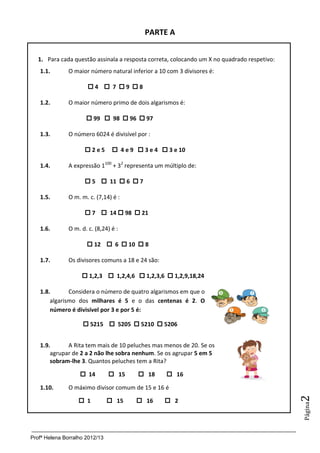2) A prova contém 12 questões de escolha múltipla e problemas matemáticos sobre números naturais, divisibilidade, decomposição em fatores primos, operações básicas e propriedades.