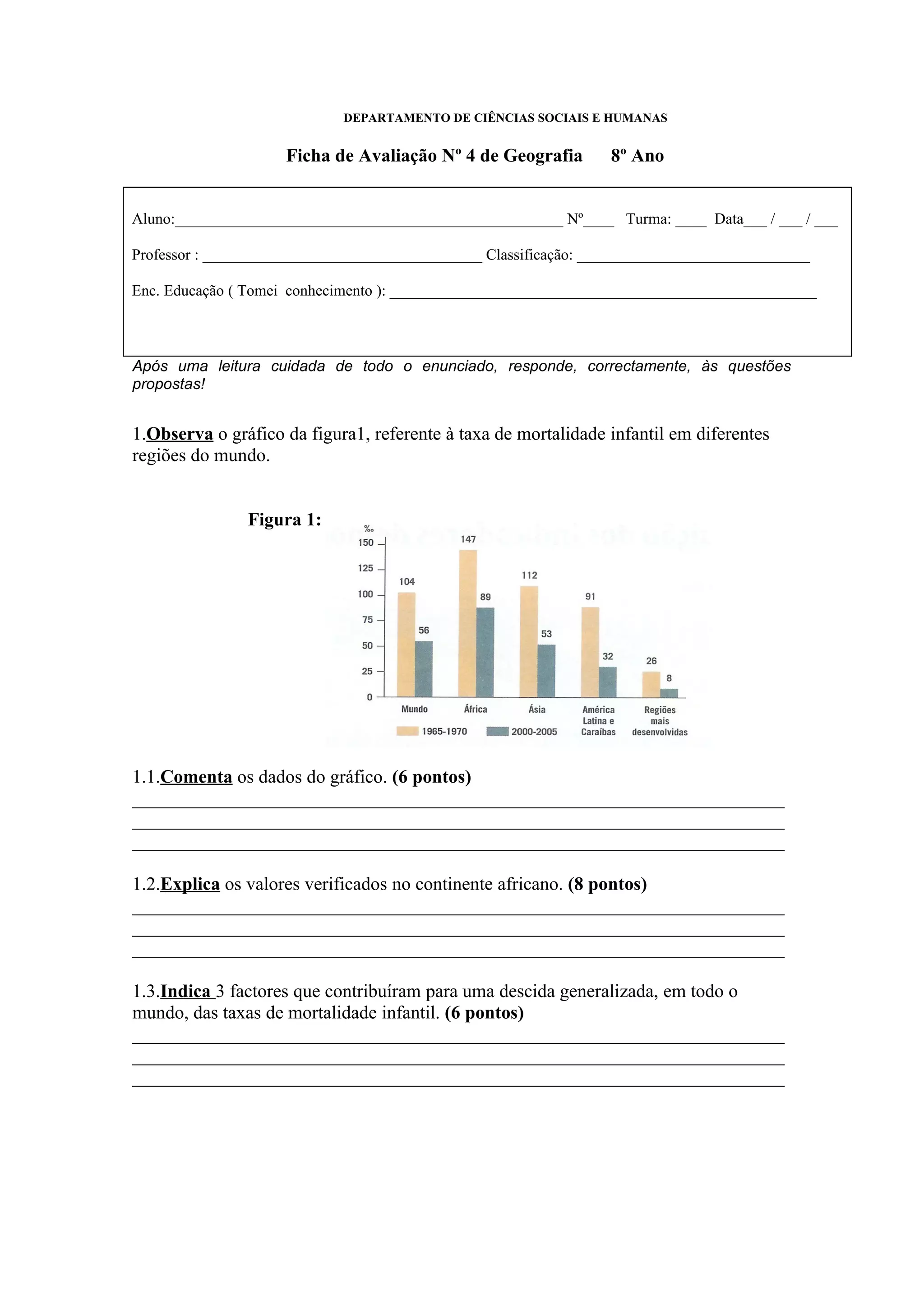 Este documento contém uma avaliação de geografia com 5 questões sobre demografia. A primeira questão analisa taxas de mortalidade infantil por região. A segunda compara taxas de crescimento natural em países desenvolvidos e em desenvolvimento. A terceira aborda as fases da transição demográfica. A quarta analisa pirâmides etárias de dois países. E a quinta discute os impactos do envelhecimento populacional nos sistemas de segurança social.