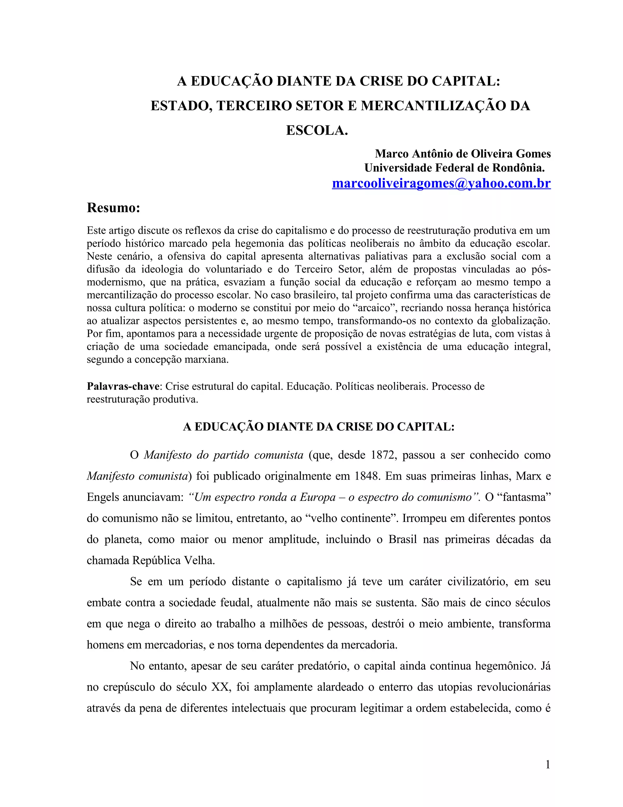 O documento discute como a crise do capitalismo afeta a educação escolar em um período de políticas neoliberais. A ofensiva do capital promove alternativas como o voluntariado e o terceiro setor que esvaziam a função social da educação e reforçam a mercantilização das escolas. O autor argumenta que é necessária uma nova estratégia de luta por uma educação emancipatória de acordo com a concepção marxiana.