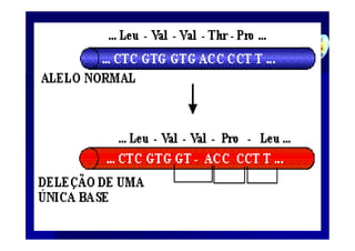 O documento discute mutações genéticas e cromossômicas. Aborda os tipos de mutações como pontuais, de inserção, de deleção e cromossômicas. Também descreve várias doenças hereditárias causadas por mutações como fibrose cística, fenilcetonúria, anemia falciforme e hemofilia. Além disso, explica síndromes como Turner e Klinefelter decorrentes de aneuploidias.