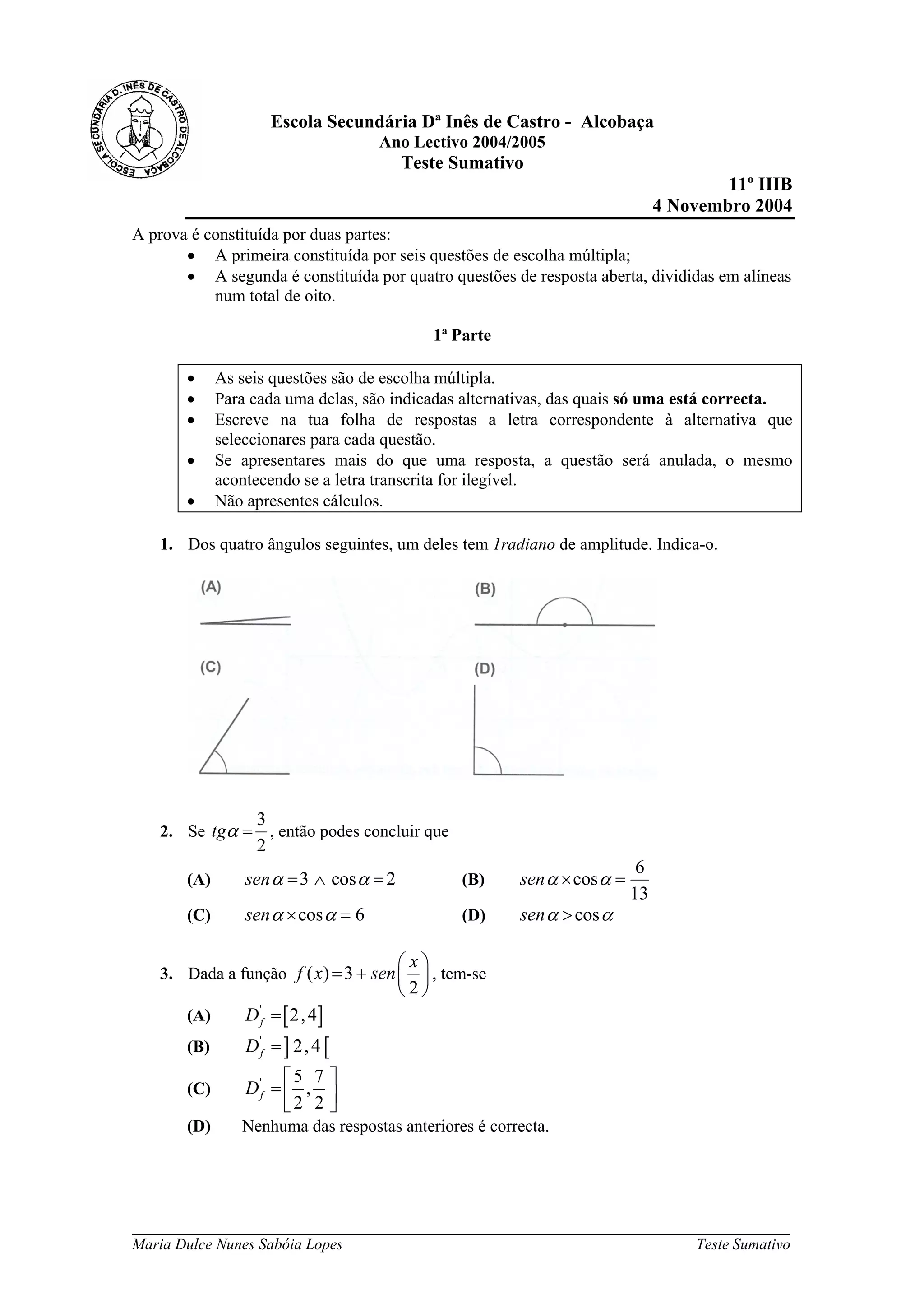 Este documento apresenta um teste sumativo constituído por duas partes. A primeira parte contém seis questões de escolha múltipla. A segunda parte contém quatro questões de resposta aberta divididas em alíneas para um total de oito questões. As instruções detalham como preencher as respostas para cada parte do teste.