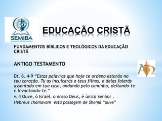O documento discute os fundamentos bíblicos e teológicos da educação cristã no Antigo e Novo Testamento. No Antigo Testamento, o Shemá de Deuteronômio 6.4-9 serviu como base para o sistema educacional hebreu, ensinando a instruir as crianças nas verdades de Deus por meio do exemplo, relacionamentos e contexto da vida. No Novo Testamento, Jesus e os apóstolos enfatizaram a importância do ensino, e Paulo treinou novos conversos por varios meses.