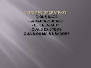 O documento descreve os principais sistemas operacionais, incluindo o que é um sistema operacional, o Windows da Microsoft, o Linux criado por Linus Torvalds e mantido por desenvolvedores, e o Mac OS da Apple, e apresenta dados sobre suas participações de mercado.