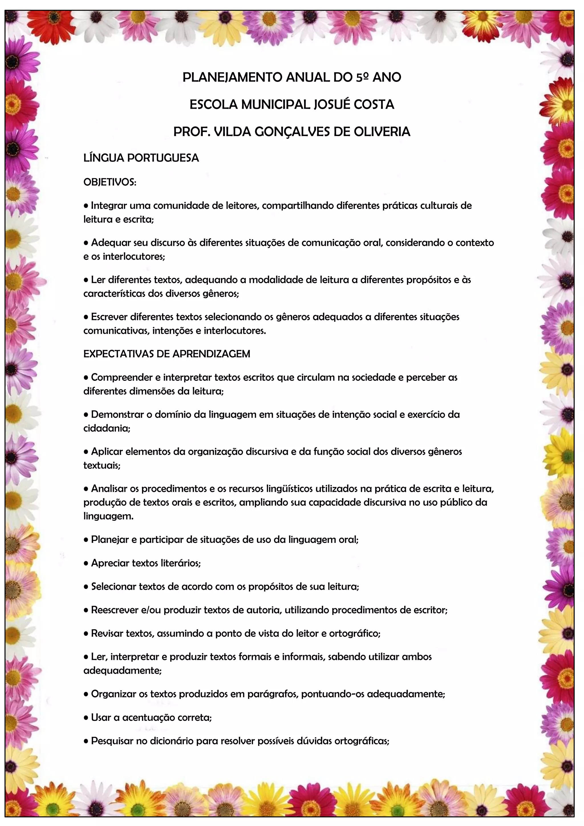 Este documento apresenta o planejamento anual da disciplina de Língua Portuguesa para o 5o ano do Ensino Fundamental. Contém os objetivos e expectativas de aprendizagem, conteúdos, habilidades e atividades a serem desenvolvidos no ano letivo, com foco em leitura, produção textual, gramática e literatura.