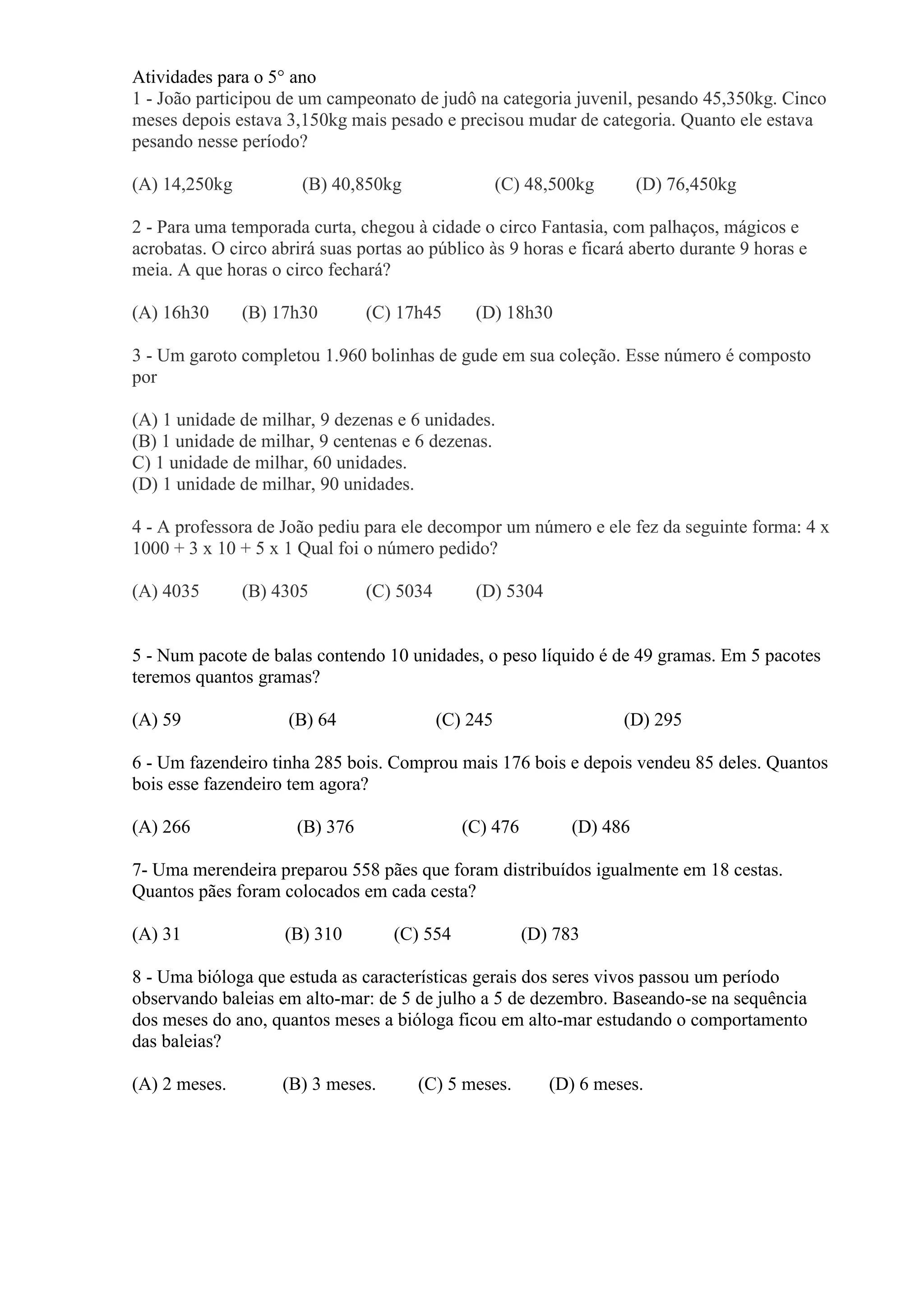 João participou de um campeonato de judô na categoria juvenil pesando 45,350kg. Cinco meses depois ele estava 3,150kg mais pesado e precisou mudar de categoria. O documento contém 8 questões sobre decomposição e composição de números, operações matemáticas e resolução de problemas.
