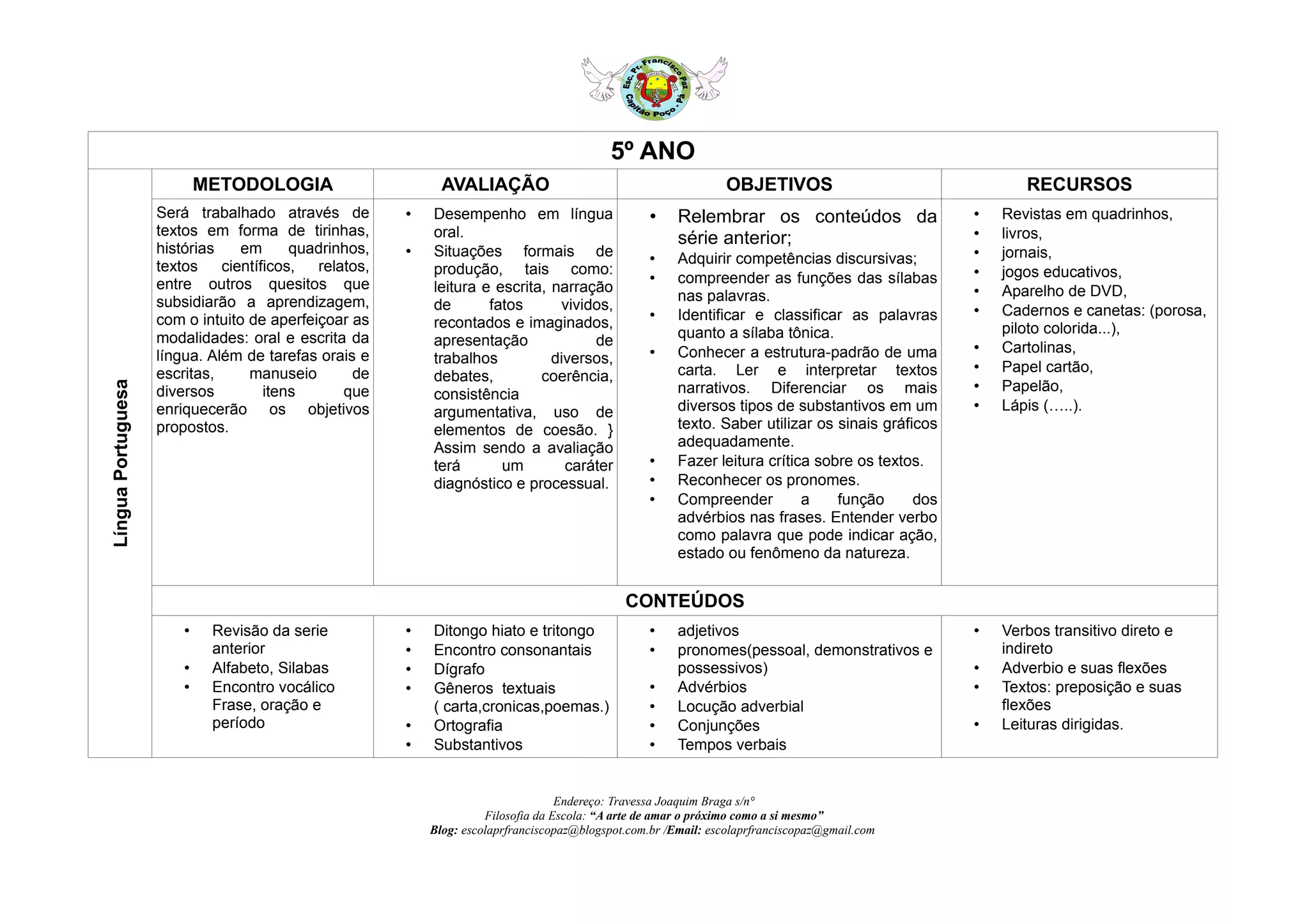 Este documento apresenta os objetivos, metodologia, avaliação, conteúdos e recursos para as disciplinas do 5o ano. As disciplinas incluem Língua Portuguesa, Matemática, Geografia, História, Artes, Ciências, Educação Física e Educação Religiosa. A aprendizagem será desenvolvida através de atividades orais, escritas e práticas, com avaliação contínua e diagnóstica.