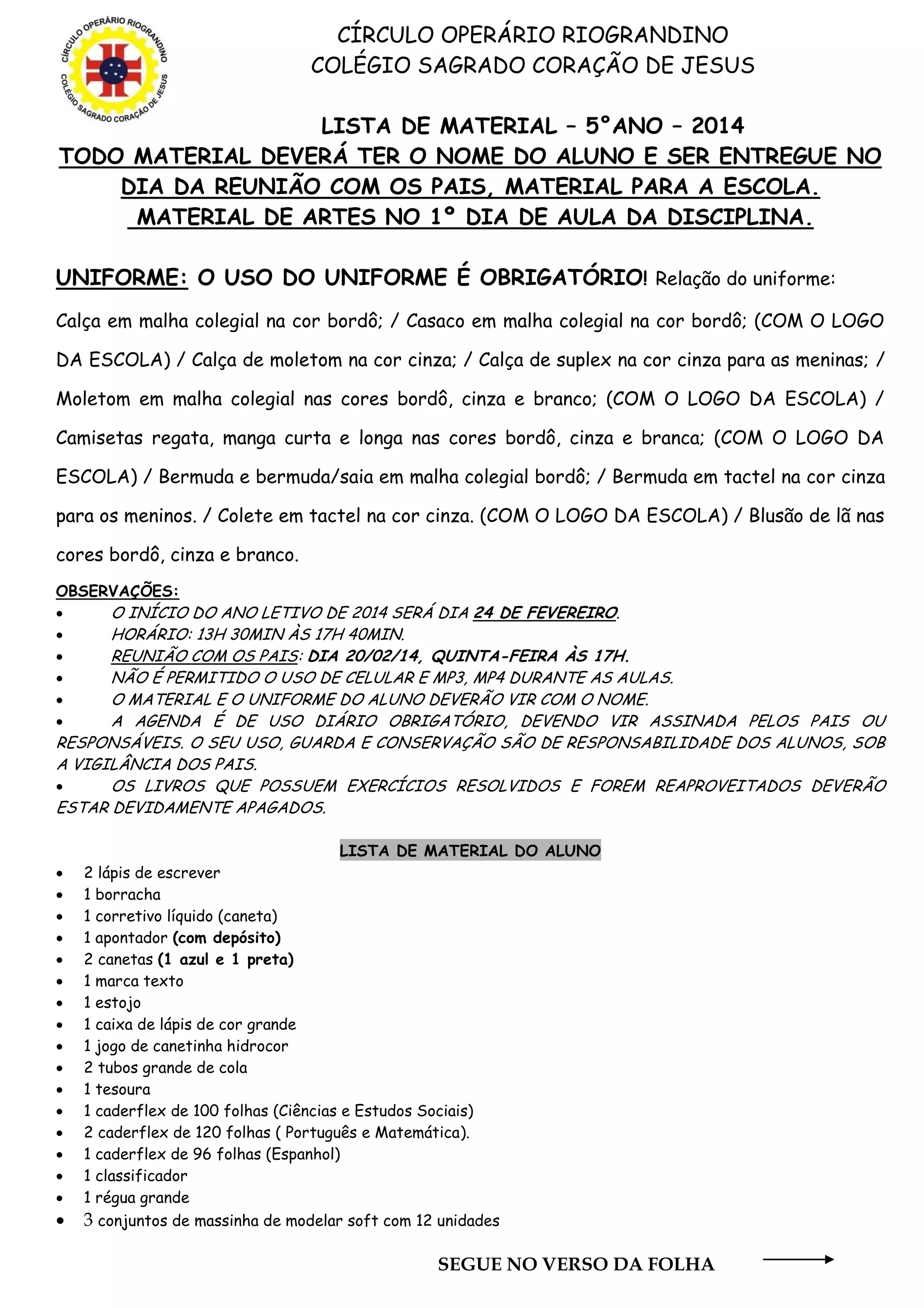 O documento lista os materiais e uniformes necessários para os alunos do 5o ano da escola em 2014, incluindo itens como lápis, canetas, cadernos e livros didáticos. Também fornece detalhes sobre o horário escolar, reunião de pais e regras sobre o uso de celulares.