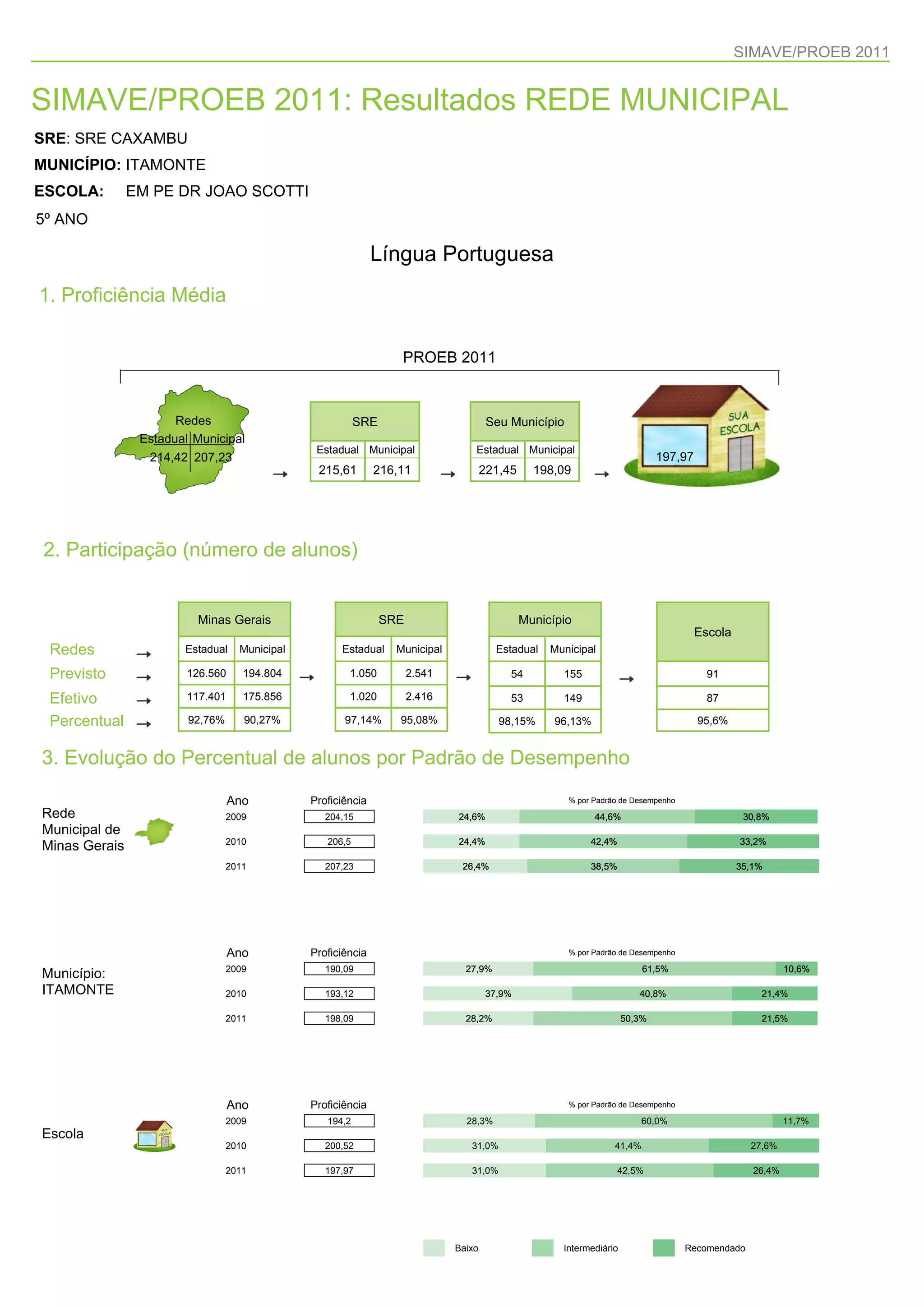 O documento apresenta os resultados da escola EM PE DR JOAO SCOTTI no SIMAVE/PROEB 2011. A proficiência média da escola foi de 197,97, abaixo da média municipal e estadual. 31,03% dos alunos tiveram desempenho baixo, 42,53% intermediário e 26,44% recomendado. A participação dos alunos da escola foi de 95,6%.