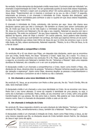 O documento descreve como Jesus chamou seus primeiros discípulos - André, Pedro, Filipe e Natanael - e os elementos essenciais do chamado de Jesus ao discipulado cristão: 1) Seguir Jesus, 2) Ter intimidade com Jesus, 3) Compartilhar Jesus com os outros.