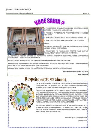 O documento relata uma visita de alunos da Escola Municipal Professora Madalena Caltabiano Salum Benjamin ao Aquário de Aparecida. Durante a visita, os alunos foram orientados por uma monitora sobre os animais marinhos presentes, como tubarão, jibóia e peixe-aranha. A visita enriqueceu o projeto que estava sendo trabalhado em sala de aula e os alunos demonstraram satisfação com as informações recebidas.